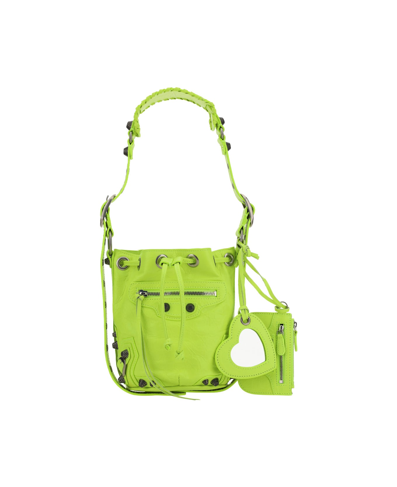 Lambskin le cagole shoulder bag by balenciaga, adjustable and removable shoulder strap, double rounded top handles, all-over silver-tone details and studs, drawstring top closure, interior zippered pocket for closure, exterior welt pocket with contrasting zipper, heart-shaped mirror applique on front.