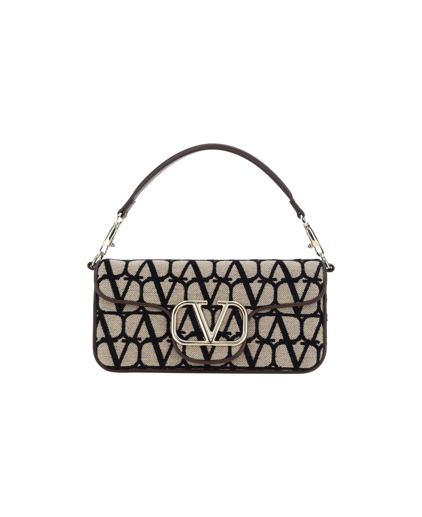 Loco handbag by valentino garavani, removable leather top strap, front closure via magnetic flap, three-dimensional plaque with iconic brand vlogo embossed on front, jacquard design with iconic all-over contrasting repeated vlogo, leather slit pocket on back, iconic brand signature press-stamped on back. Composition: 40% % Cotton, 27% % Polyester, 33% % Viscose