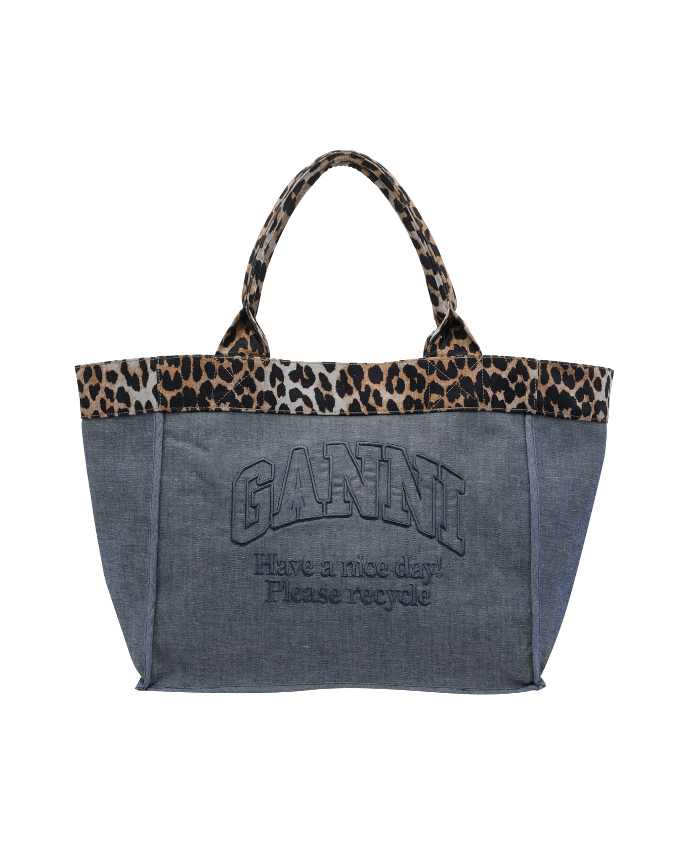 Ganni blue tote bag, logo on the front, inner zip pocket, 2 open pockets, 2 handles, animalier print detail Composition: 61% Cotton, 20% Viscose, 19% Polyester