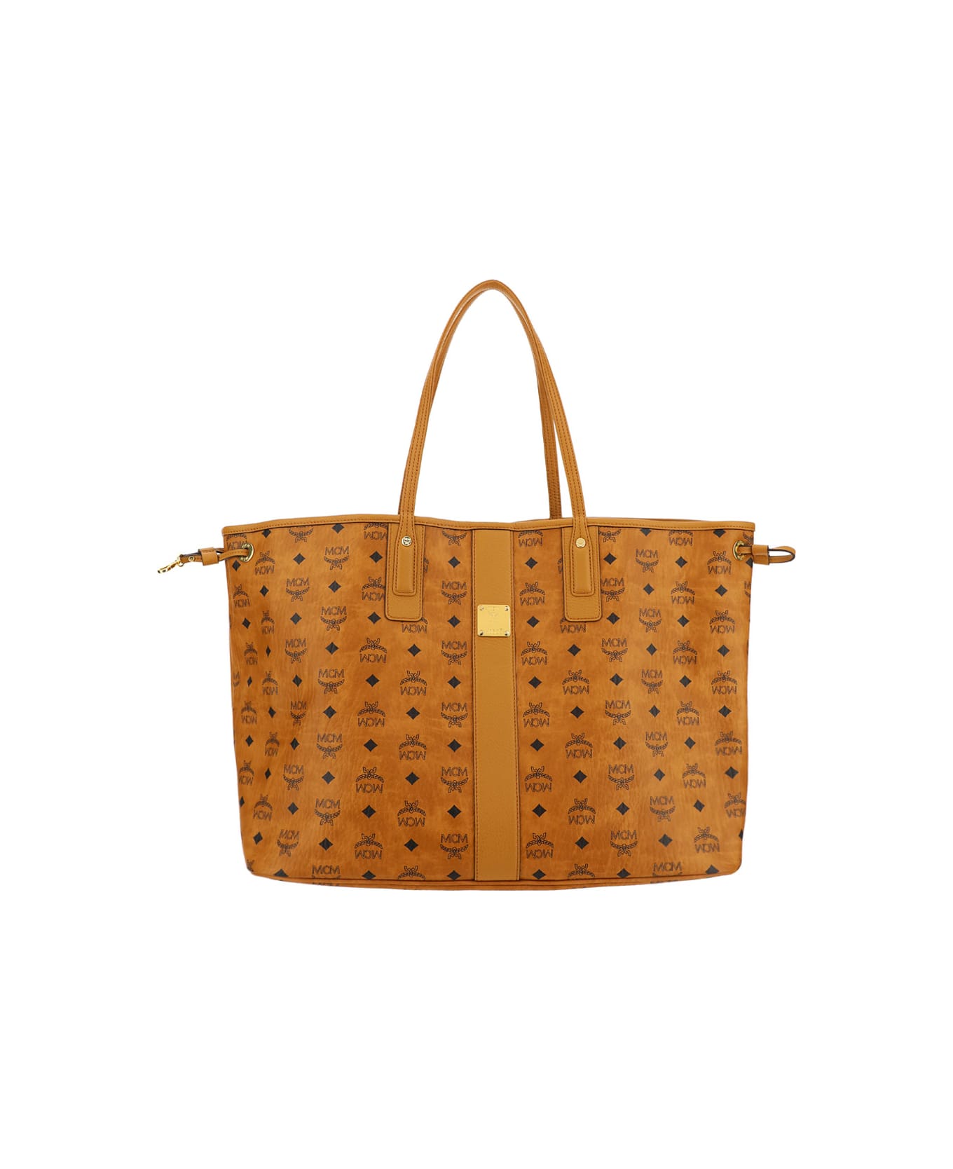 Calfskin Liz Shopper Large Bag by MCM, coated finish, leather trim, reversible, contrasting monogram print, two top handles, mettalic patch with engraved logo, main compartment, open top.
