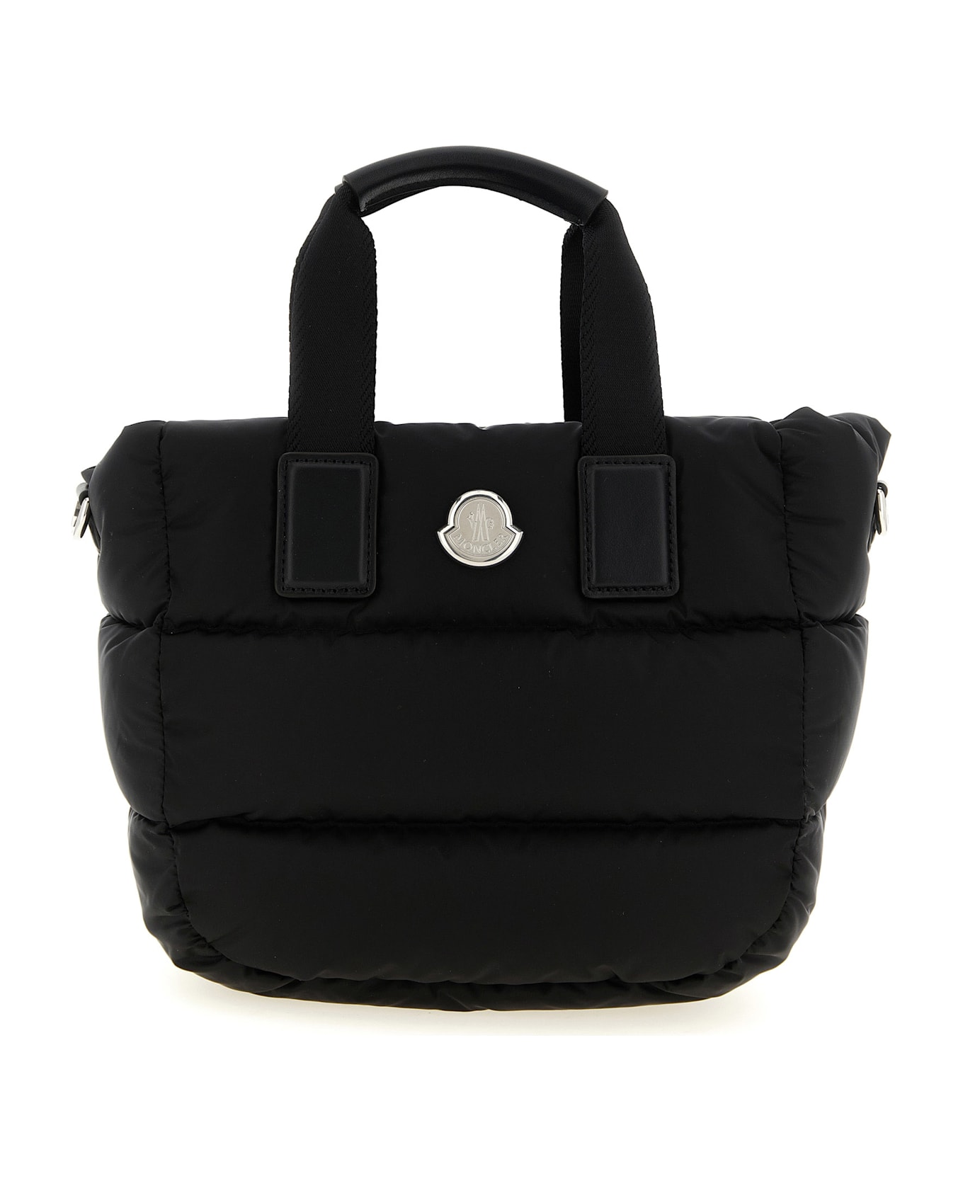 Mini Caradoc' quilted and padded Teflon nylon handbag with tone-on-tone leather details, nylon drill lining, antiqued metal logo patch on the front, double fixed tape handle with leather handle, top zip closure, adjustable and removable shoulder strap.
