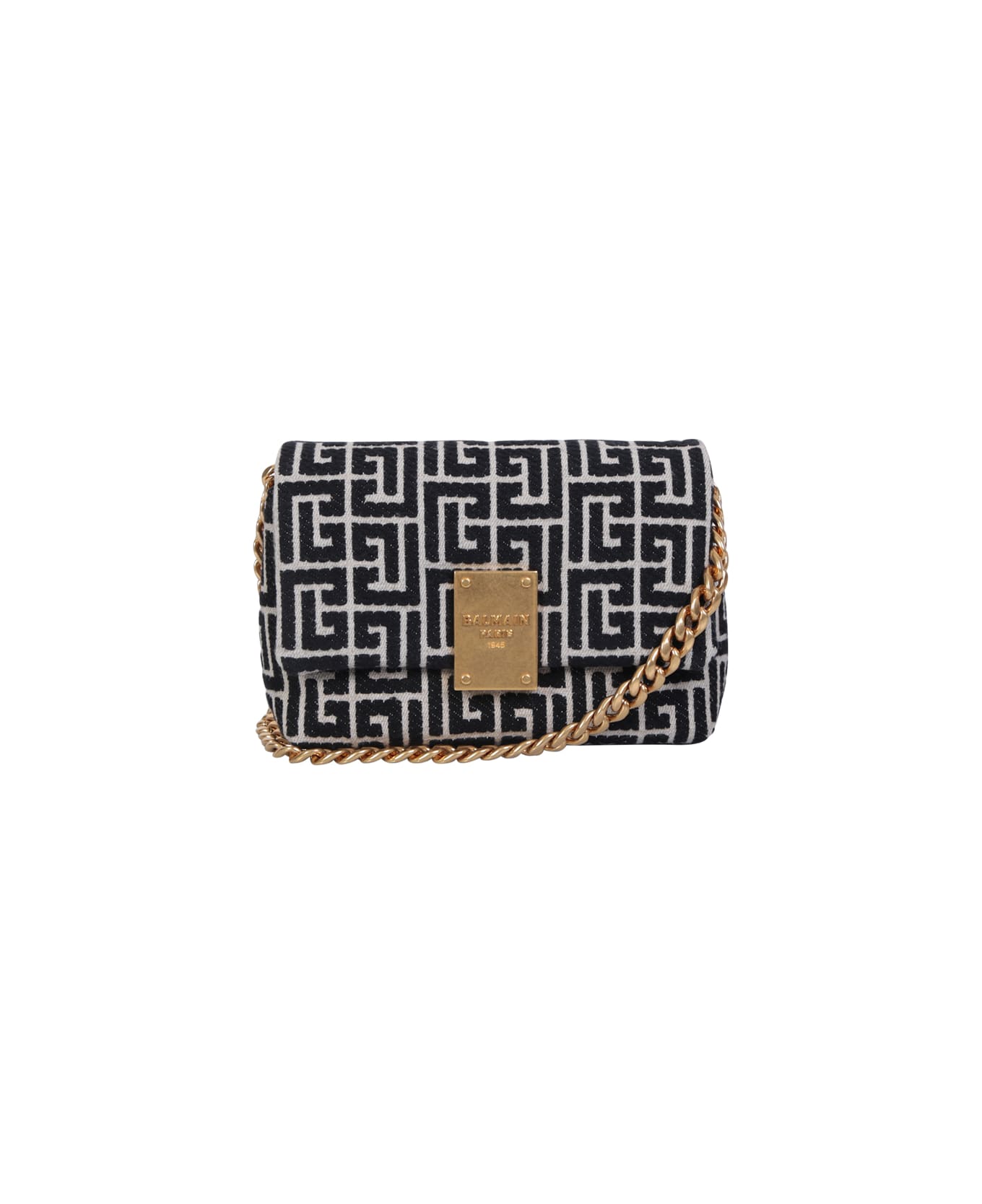 Foldover top. Magnetic fastening. Main compartment. Internal slip pocket. Plaque logo. Chain link shoulder strap. All-over monogram motif. Gold tone hardware. Color: white/ black