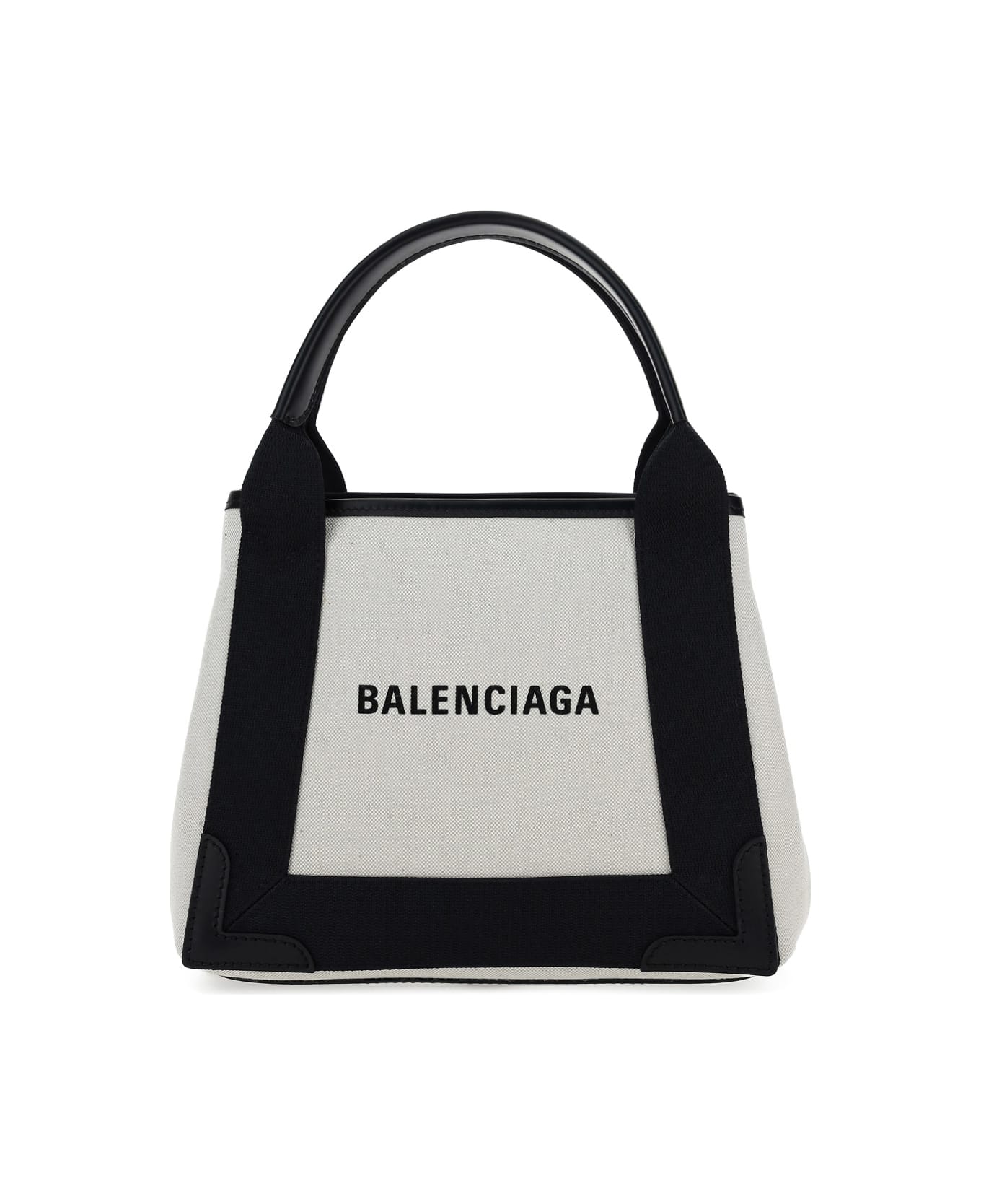 Cotton cabas handbag by balenciaga, two rigid leather handles, iconic contrasting brand monogram on front, thin leather shoulder strap, snap buttons on sides, interior pouch with zipper closure.