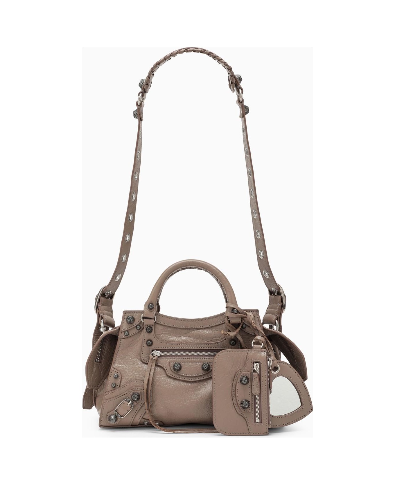 Grey leather bag from Balenciaga. The details include: an adjustable shoulder strap, a woven leather shoulder pad, two leather top handles, a top zip fastening with a knotted leather puller, a front zip pocket, a removable zipped pouch, a removable heart mirror, a tone-on-tone embossed logo on the mirror, silver-tone metal hardware and a cotton canvas lining.