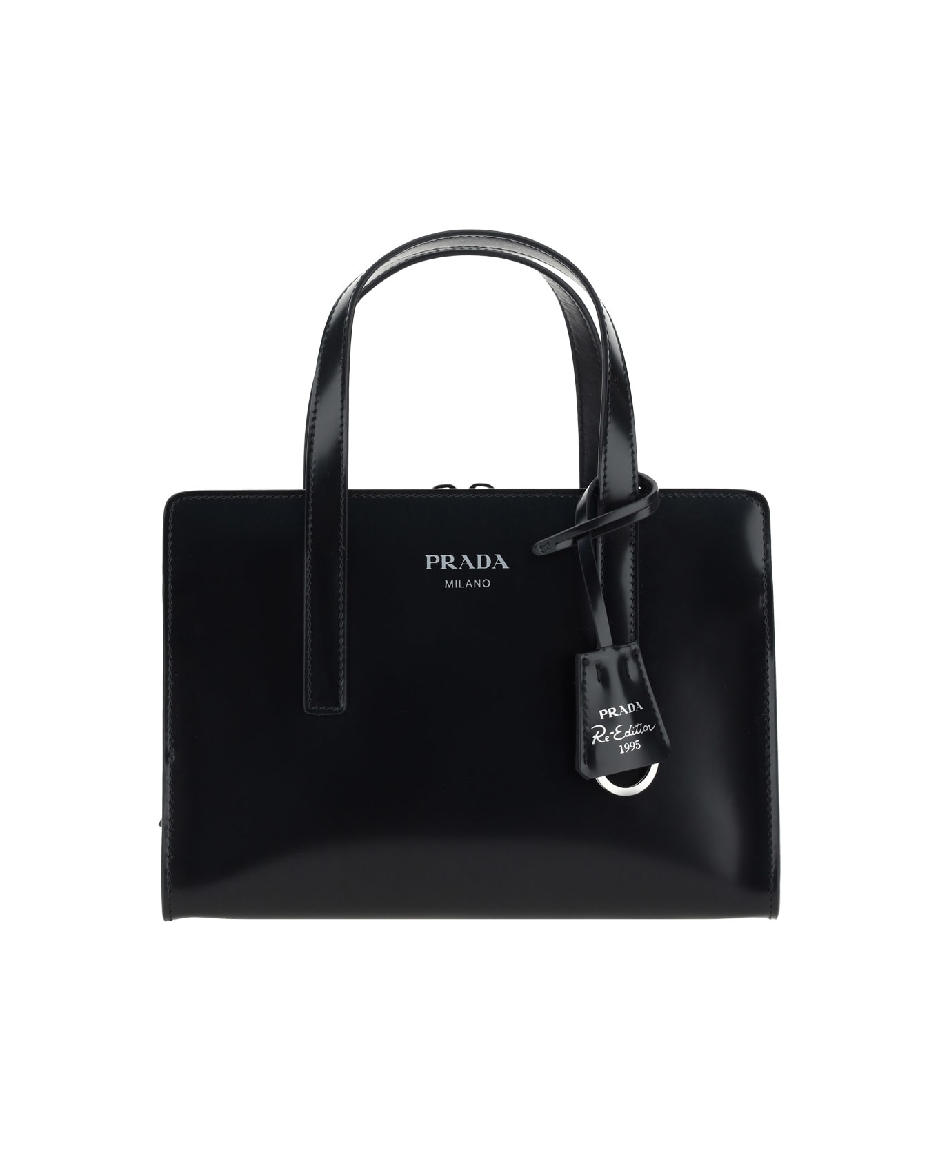 Calfskin re-edition 1995 handbag by prada, double flat top handles, removable and adjustable shoulder strap, top zipper and double slider closure, shiny leather design, iconic brand monogram press-stamped on front, interior welt pocket. Composition: 100% % Calf Leather Bos Taurus