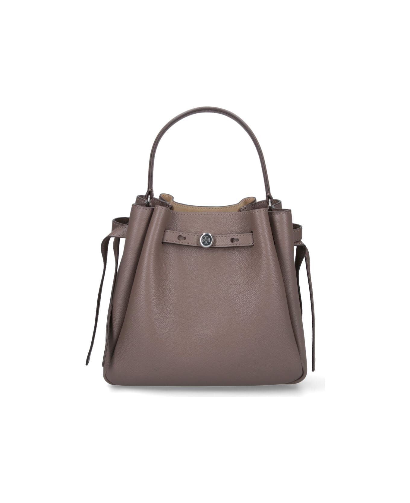 Tory Burch 'Romy' bucket bag in taupe calf leather with top handle, adjustable and removable shoulder strap, drawstring and magnetic flap closure, silver metal logo on the front, inner slip pocket, main inner compartment.