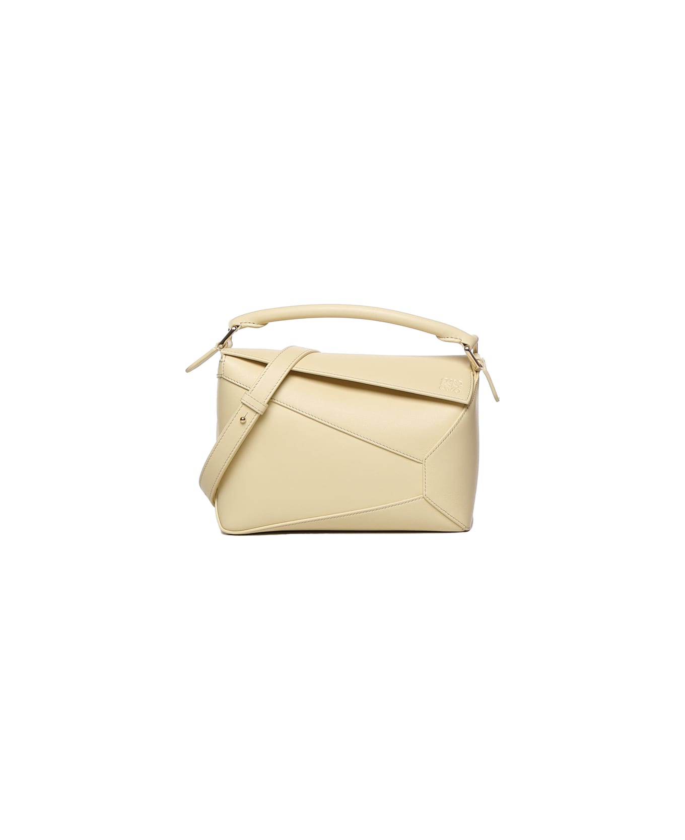 Vanilla Small Puzzle Bag In Classic Calfskin from Loewe -Cuboid shaped bag -Detachable and adjustable shoulder strap -Internal slip pocket and external zip pocket on the back -Customizable with strap and personalization charms -Embossed anagram -Measurements: 16. 5 x 24 x 10. 5 cm - Made in Spain -Color: Vanilla -100% Calfskin