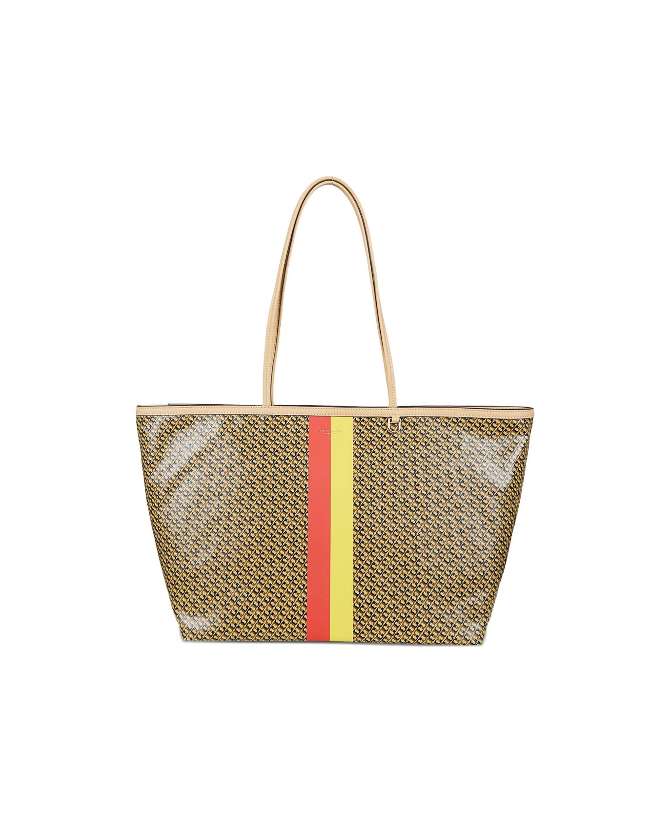 brown/multicolour all-over logo print two top handles stripe detail
