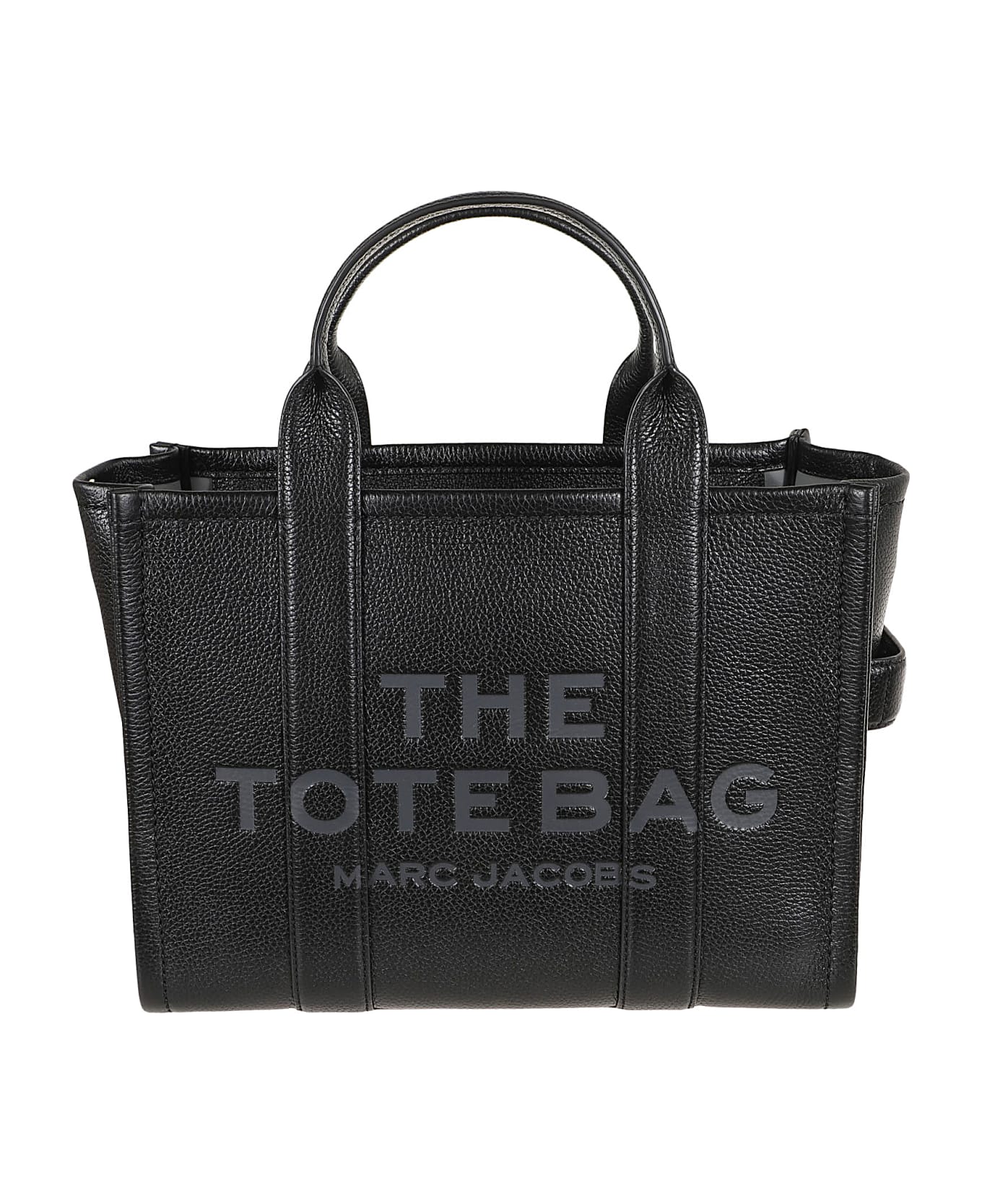 The Small Leather Tote Bag BY MARC JACOBS. Grainy texture, front engraved logo, back logo patch, two top handles, adjustable and detachable shoulder strap, single side flat handle, top zip closure, main compartment, internal zip closed pocket and multiple internal slip pockets. Available in different colors.