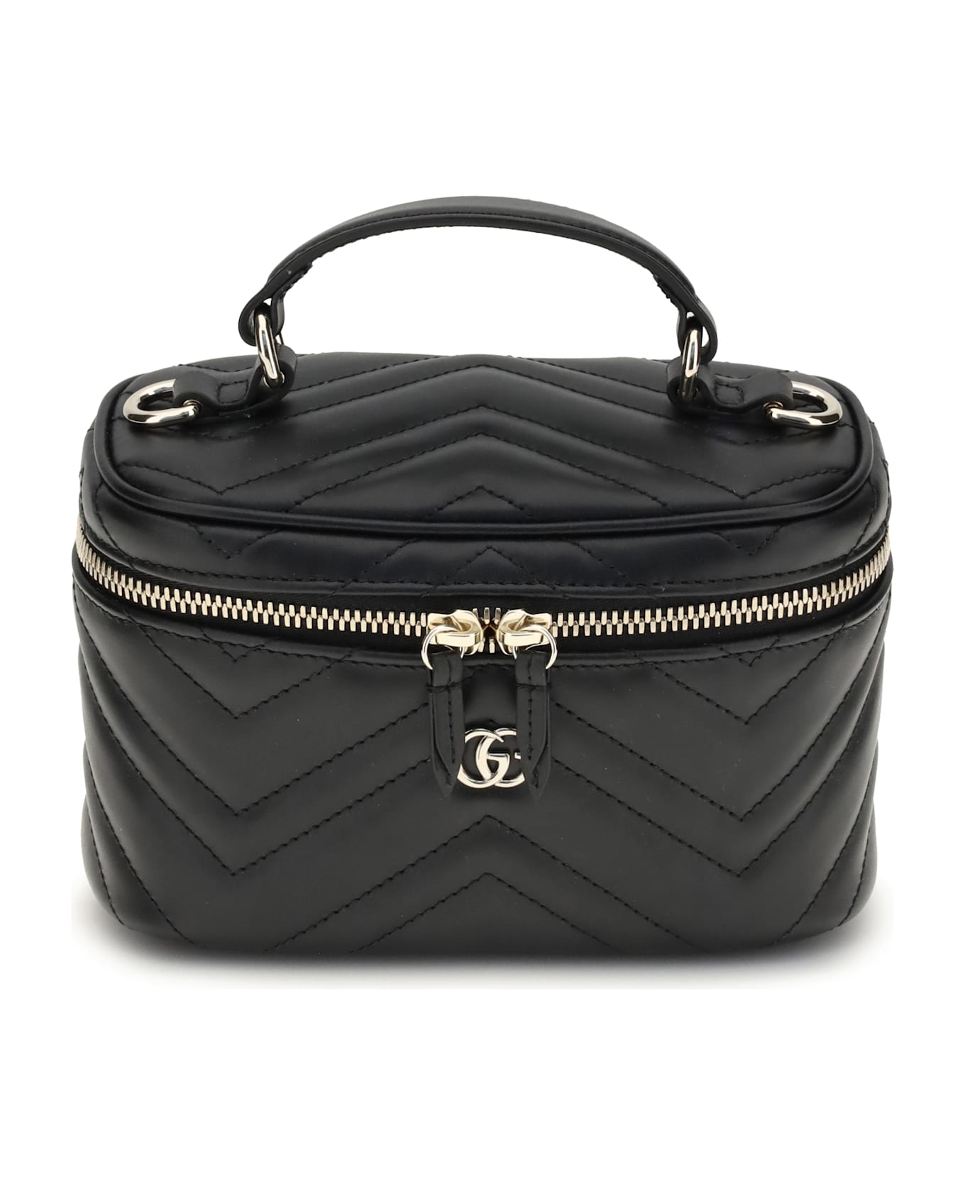 Gucci's vanity mini shoulder bag is a compact and sophisticated accessory made of black matelassé leather with the iconic chevron pattern. light gold hardware enhances the design, while the black taffeta lining adds a touch of inner elegance. topping it off is the emblematic double g on the front, the distinctive symbol of the maison. Composition: 100% % Calf Leather Bos Taurus
