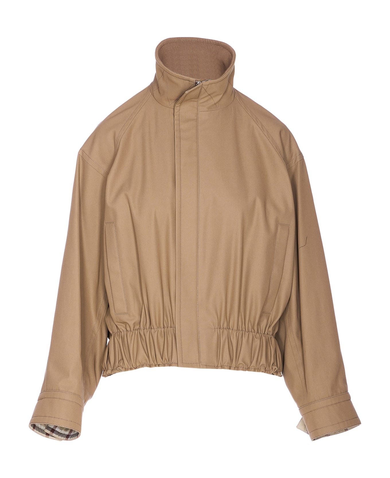 Bottega Veneta dark beige jacket with frontal zip closure, high neck, lateral pockets with button closure, elasticized on waist, high neck