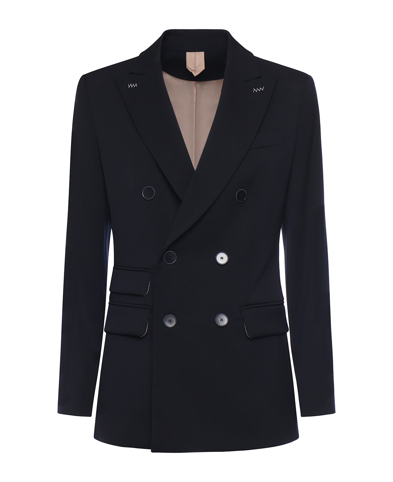 -Made of wool gabardine -Double-breasted -Patch pockets -Peak lapel -Made in Italy -Size shown is 40 -Color: Navy Blue