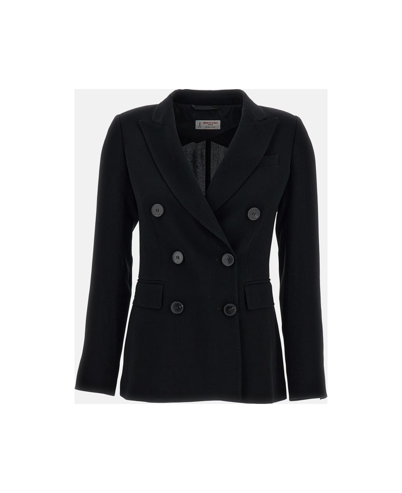 Double-breasted jacket Front button closure Double flap patch pockets Slim fit Pointed notched lapels Center back vent Color: black Made in Italy