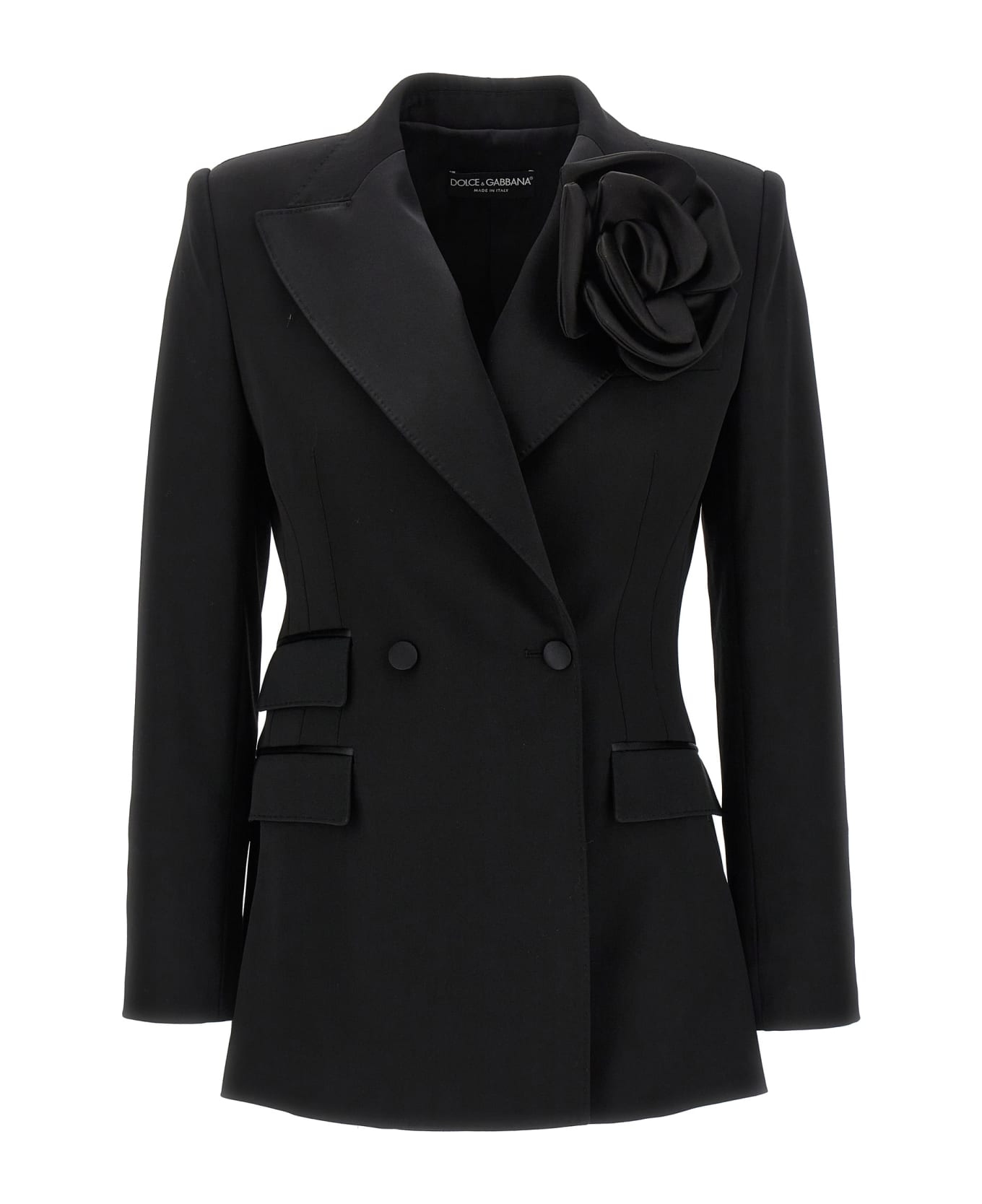 Double-breasted blazer in wool and silk blend with flap pockets and satin peak lapels, floral application detail. Composition: 76% wv 17% se 5% pl 2% ea