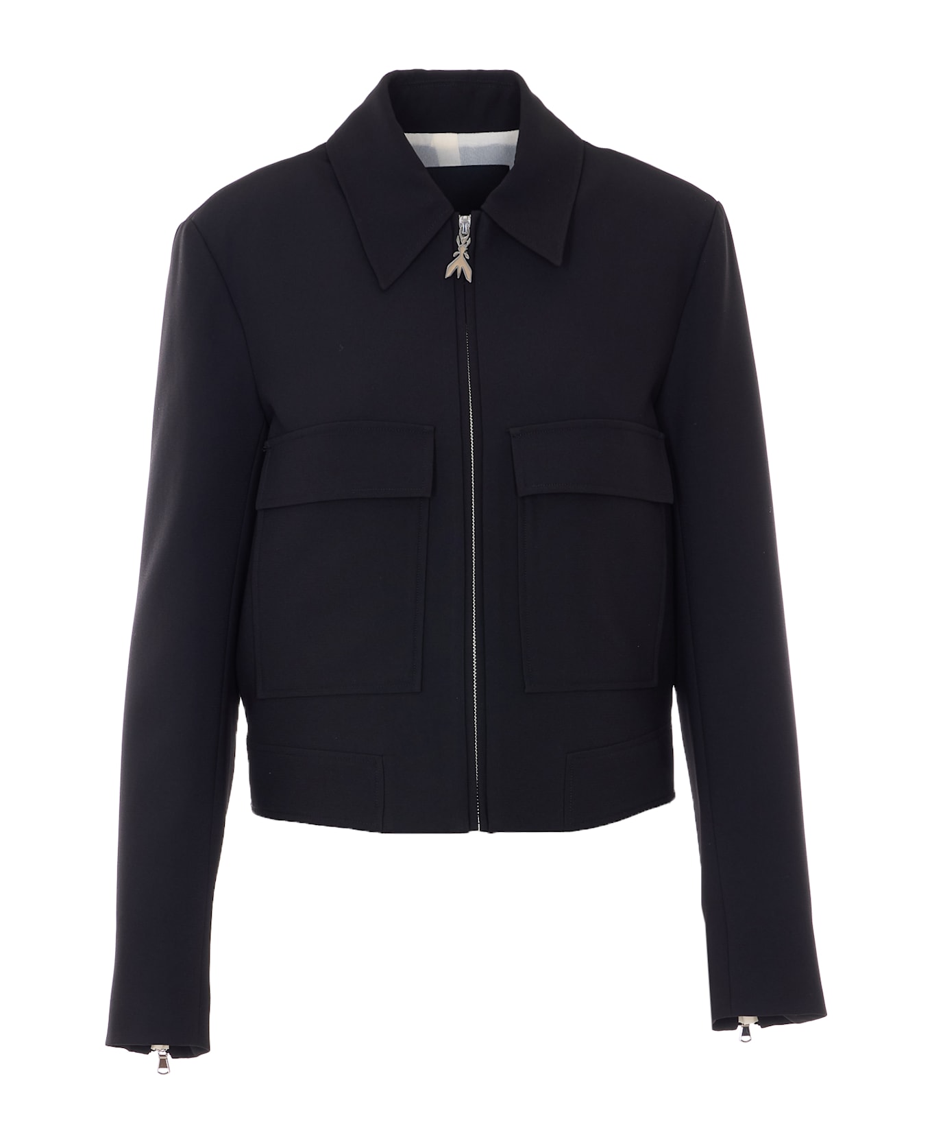 Patrizia Pepe black jacket with frontal zip closure, regular collar, pockets on the front, long sleeves, zip on sleeves