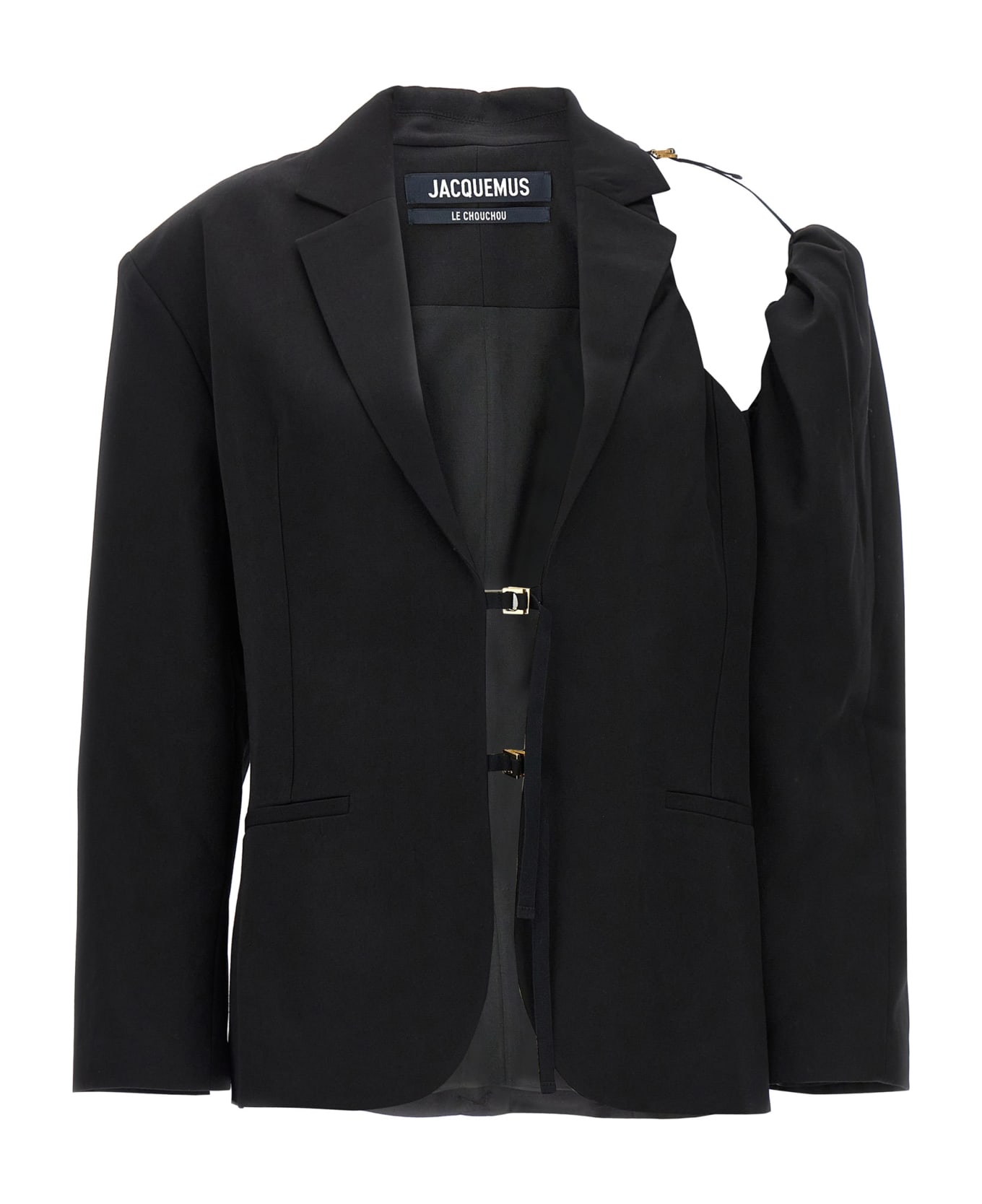 'La veste galliga' single-breasted wool blazer with front opening and the possibility of being closed by adjustable buckles, asymmetrical model with a regular sleeve and a wide puff sleeve with cut out on the shoulder. Composition: 100% virgin wool