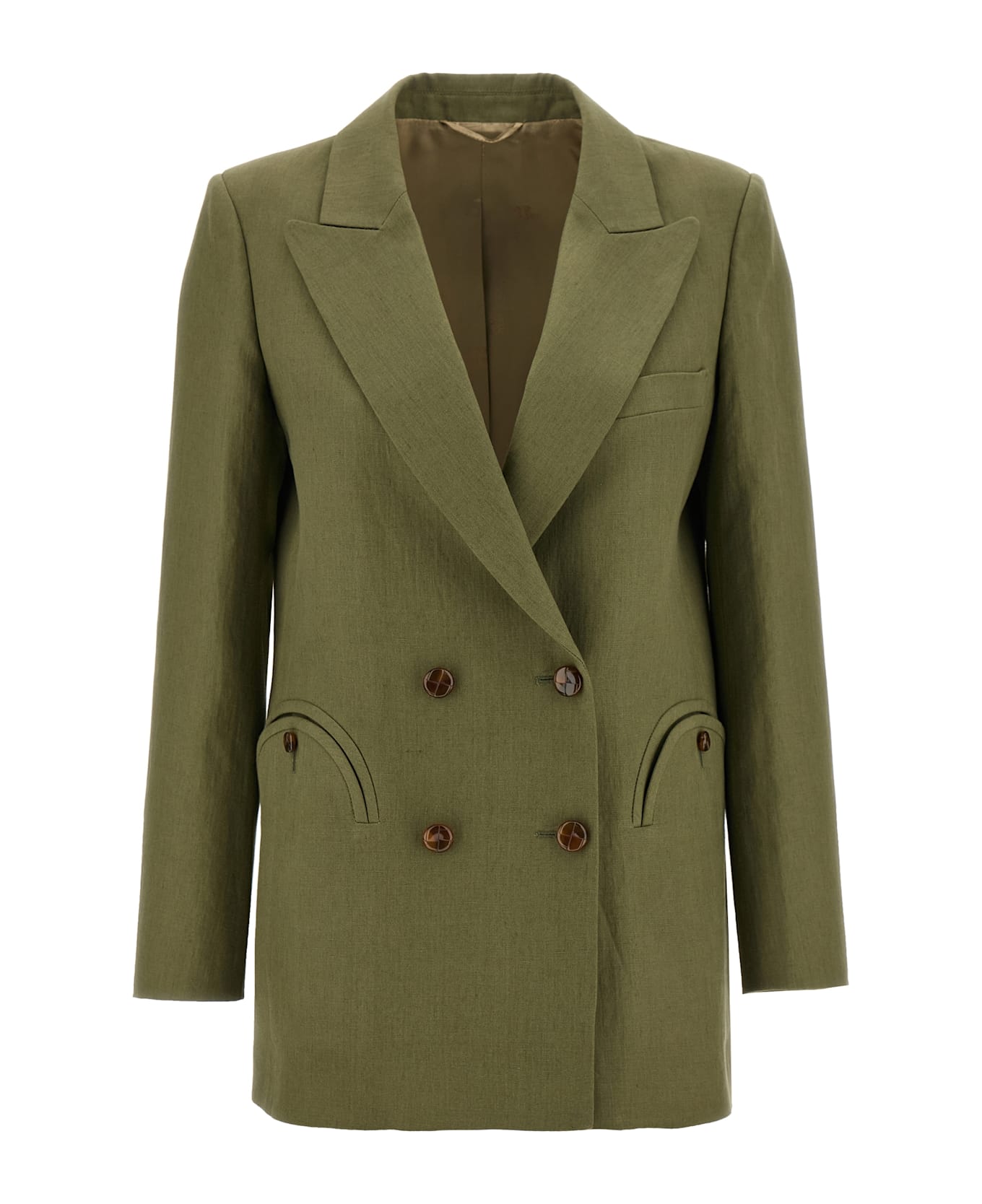 'Mid-day Sun Everyday' double-breasted light linen blazer with front woven glossy button closure, peak lapels, breast pocket, 'Smiley' pockets, four inner pockets, long sleeves, structured shoulder strap, back split, monogram viscose lining.