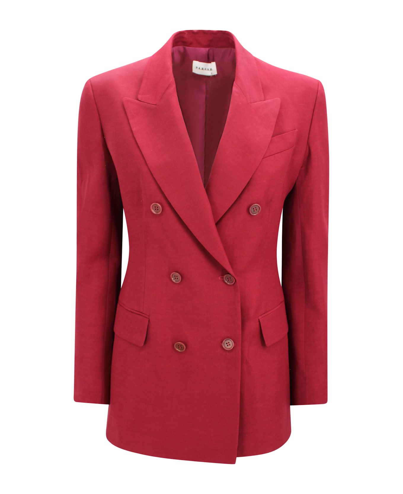 Jacket crafted in red, featuring a double-breasted design with button fastening. The style includes peak lapels, front flap pockets, and long sleeves, creating a structured and refined silhouette.
