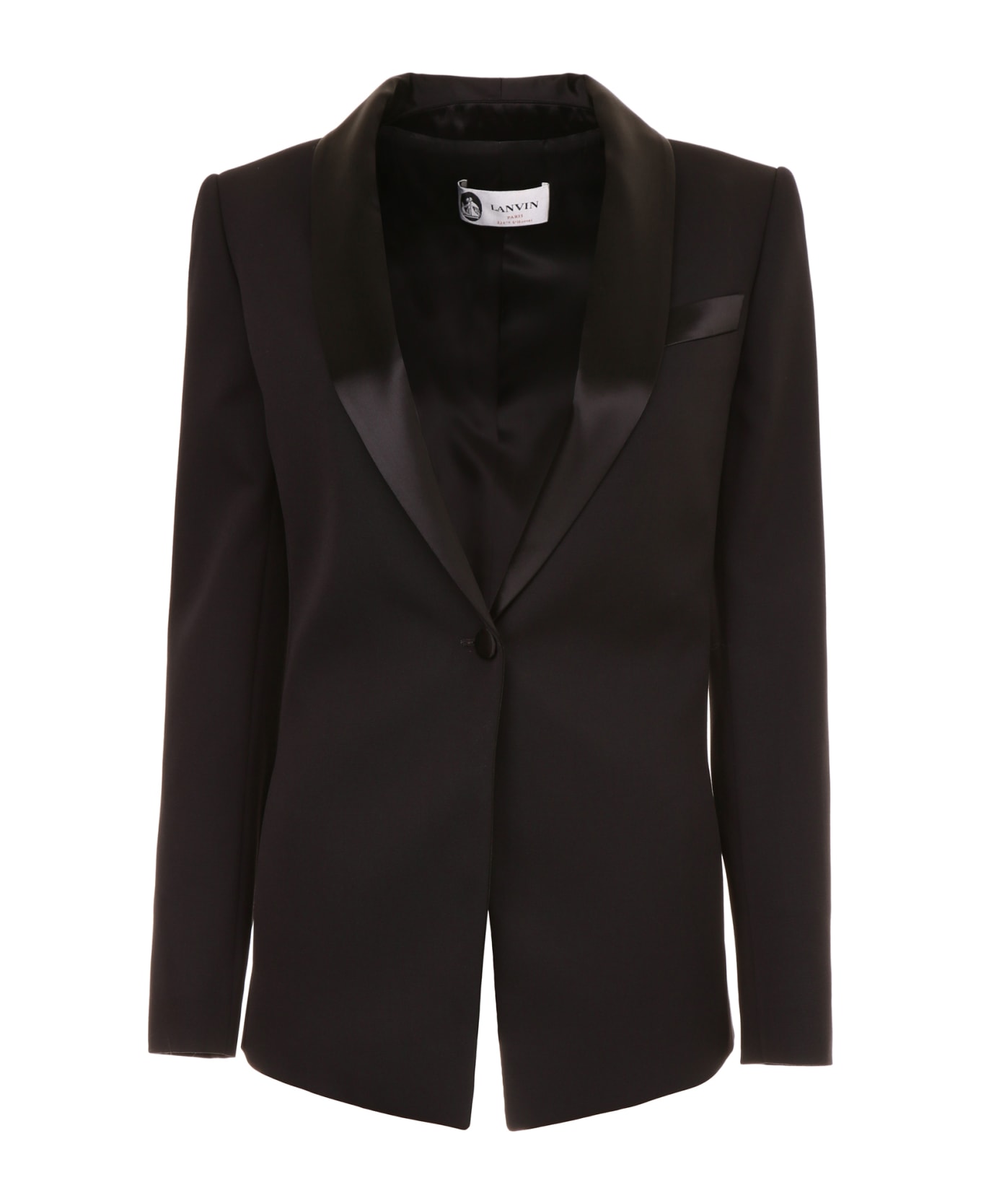 Lanvin wool gabardine tuxedo blazer with one-button closure and satin shawl lapels. Cupro lining, padded shoulders, side slit pockets, satin-trimmed pocket on the chest. Model height is 177 cm and she is wearing a size FR 36. Composition: 98% lana, 02% elastan