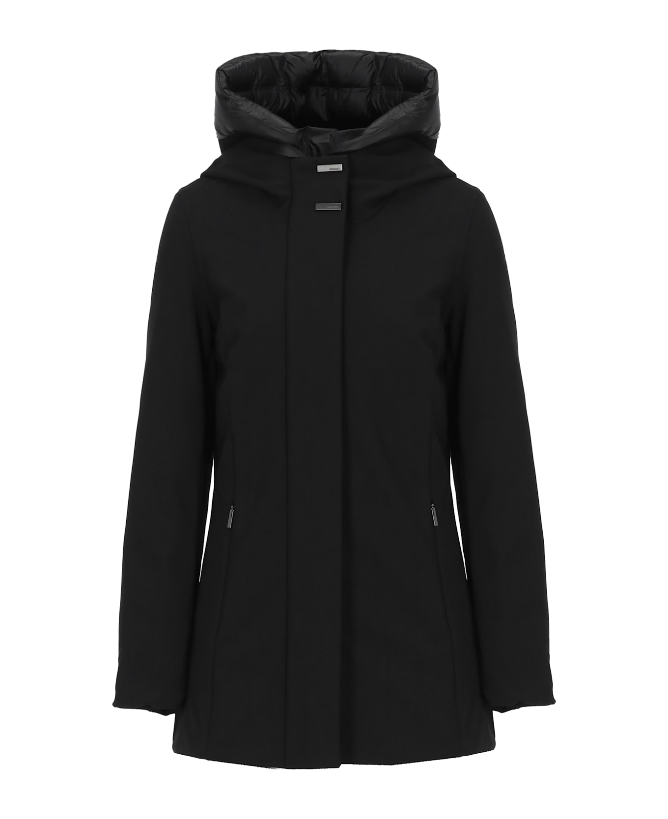 - RRD Roberto Ricci Design woman's black padded coat - Hood - Long sleeves with logoed patch at left sleeve - Front zip fastening - Two side zip pockets Composition: 80% Polyamide, 20% Elastane Lining:, 100% Polyamide Filling:, 90% Duck Down, 10% Duck Feathers
