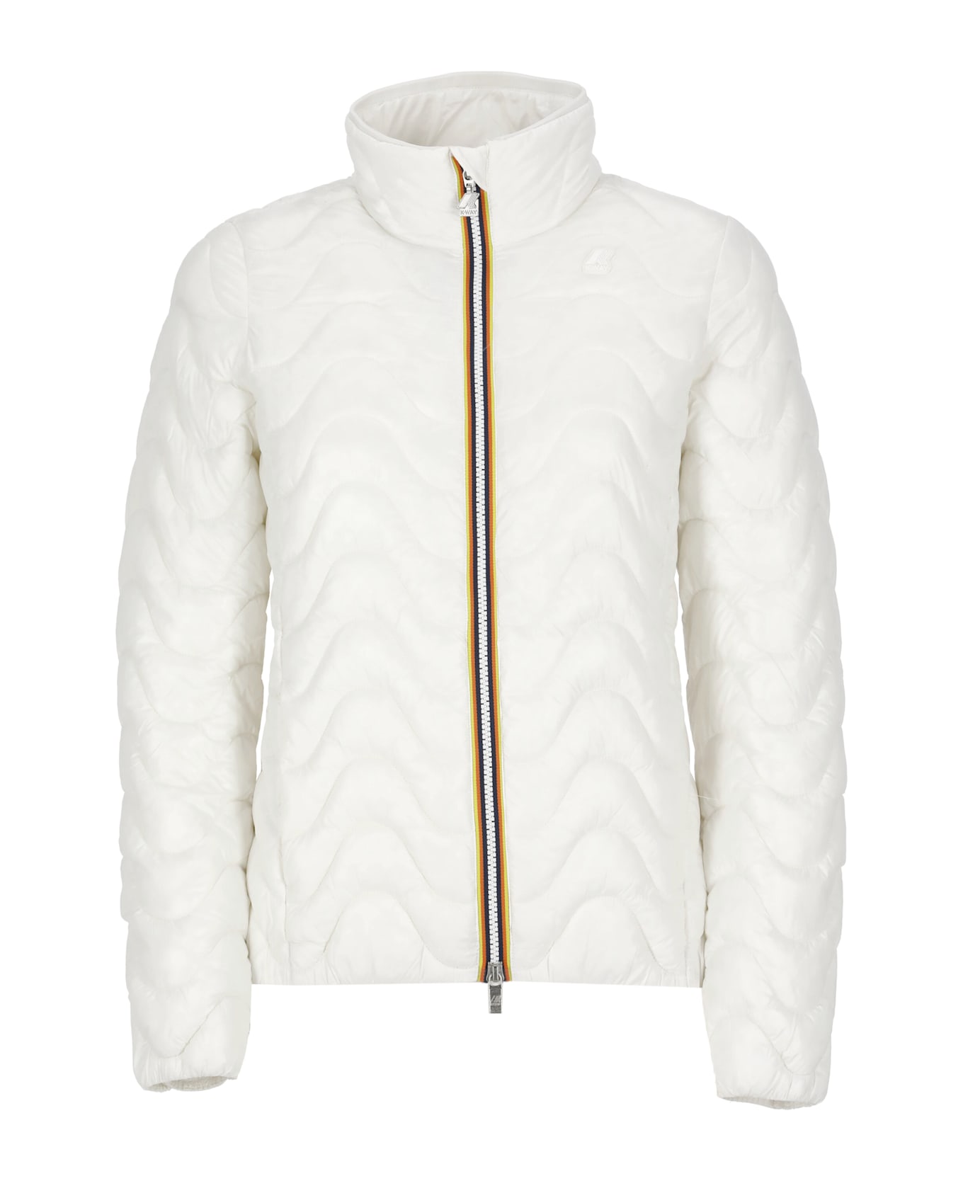 - White K-Way waterproof fabric padded and quilted jacket for woman - High neck - Front double slider zip fastening - Front contrasting color iconic band - Front tone on tone logoed patch - Elastic trims - Two internal pockets