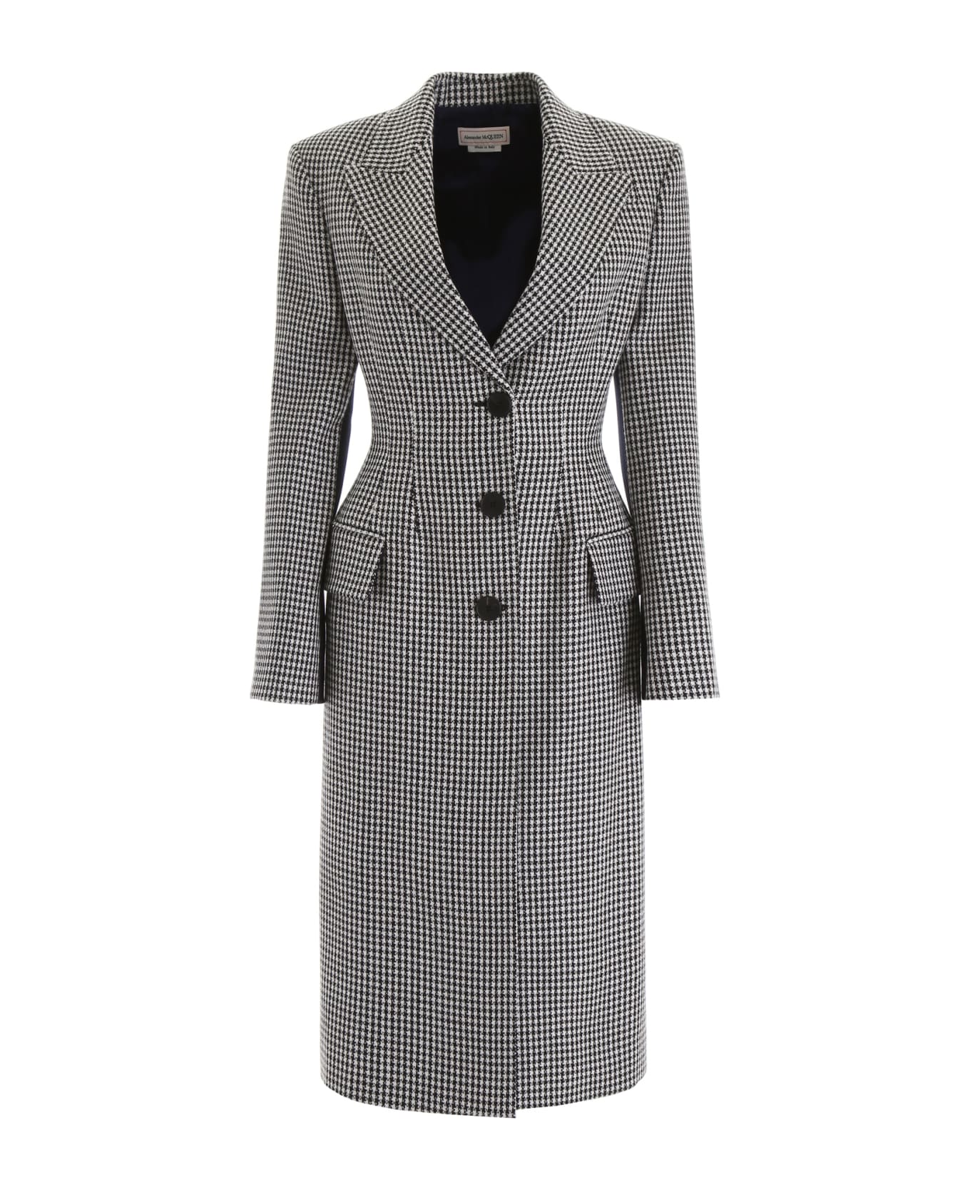 Alexander McQueen houndstooth wool coat with blue satin back. It features horn buttons, peak lapels and flap pockets. Cupro lining. Model height is 177 cm and she is wearing a size IT 40. Composition: 100% lana vergine, 100% seta