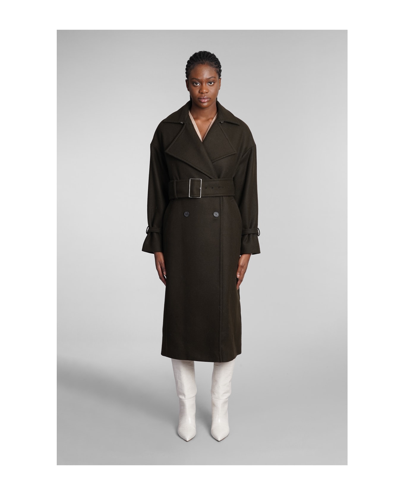 Kealia Coat in khaki wool, revers, double breasted closure, belt waist, pockets on side, trench design, 60% wool, 25% Polyester, 10% polyamide, 5% others fibers, Made in Romania, Model is 180 cm and wears 38