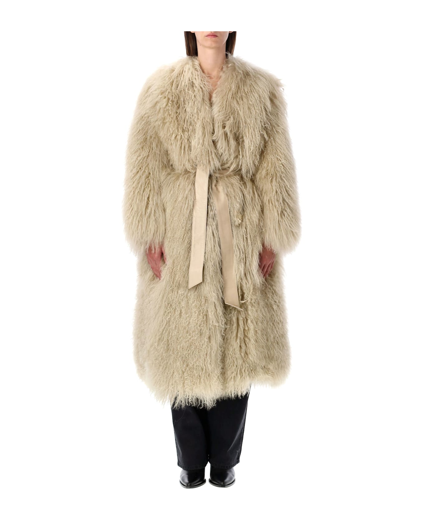 Dramatic And Luxurious, This Sword Maxi Coat Is Crafted From Genuine Mongolian Shearling, Offering Warmth And A Striking Voluminous Silhouette. Designed With Long Sleeves, A Floor-length Cut And A Matching Tie Belt, It Wraps The Body In Soft Texture While Defining The Waistline. Its Natural Shade Enhances Its Statement Allure, Making It The Perfect Outerwear For Bold Winter Elegance. Genuine Mongolian Shearling Maxi Coat Voluminous Silhouette With Natural Texture Long Length With Full Sleeves Detachable Tie Belt At Waist Luxurious And Warm Outerwear Piece Alessandra Is 1,75 M And Wears Size S