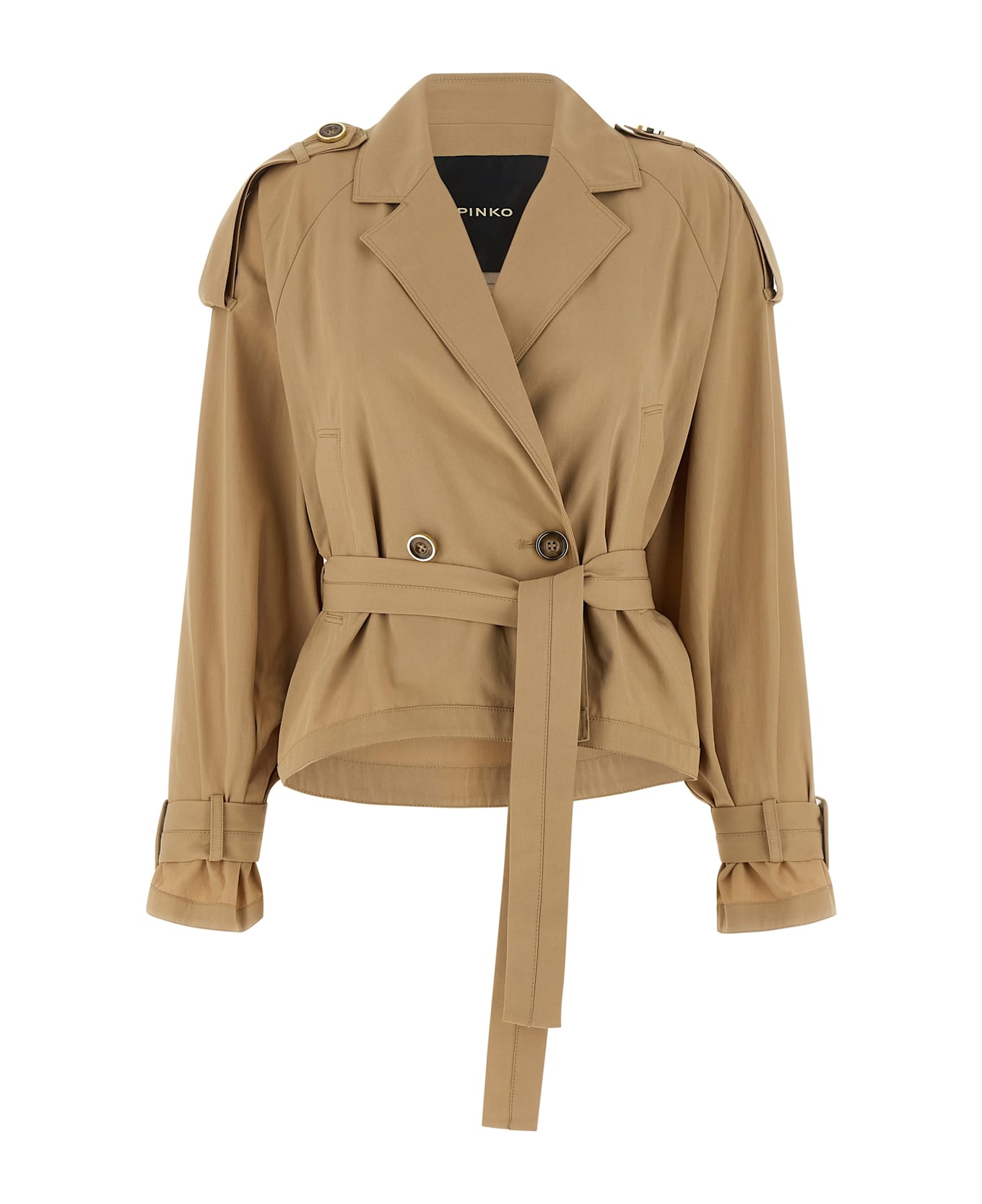 'Tanya' double-breasted short trench coat in cotton twill with front metal closure, lapel collar, pockets, raglan sleeves with frog on the shoulder and strap cuffs, unlined, removable belt.
