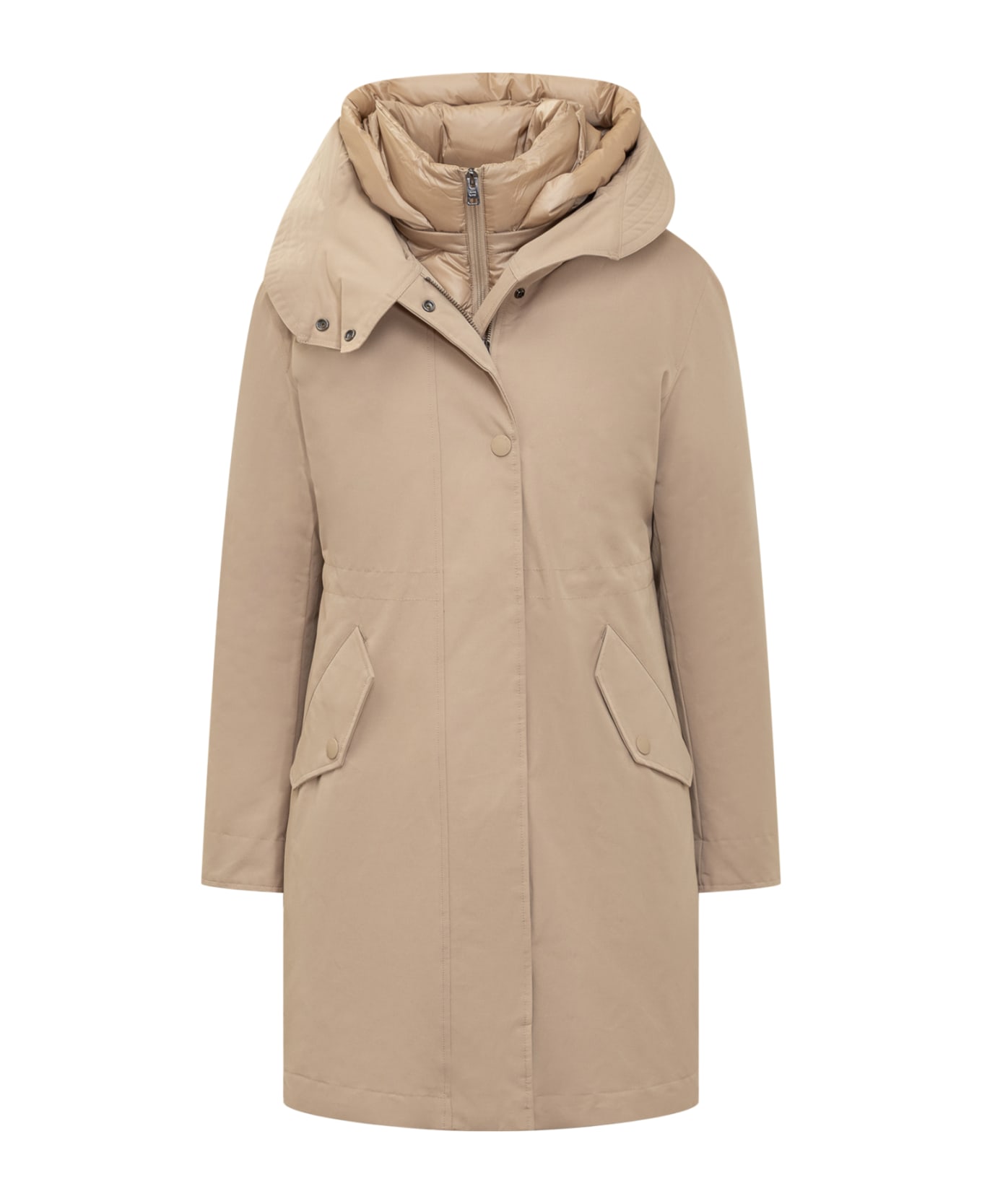 Long parka with hood. Duvet insert. Zip and button closure. Two side pockets with flap and buttons. Logo patch.