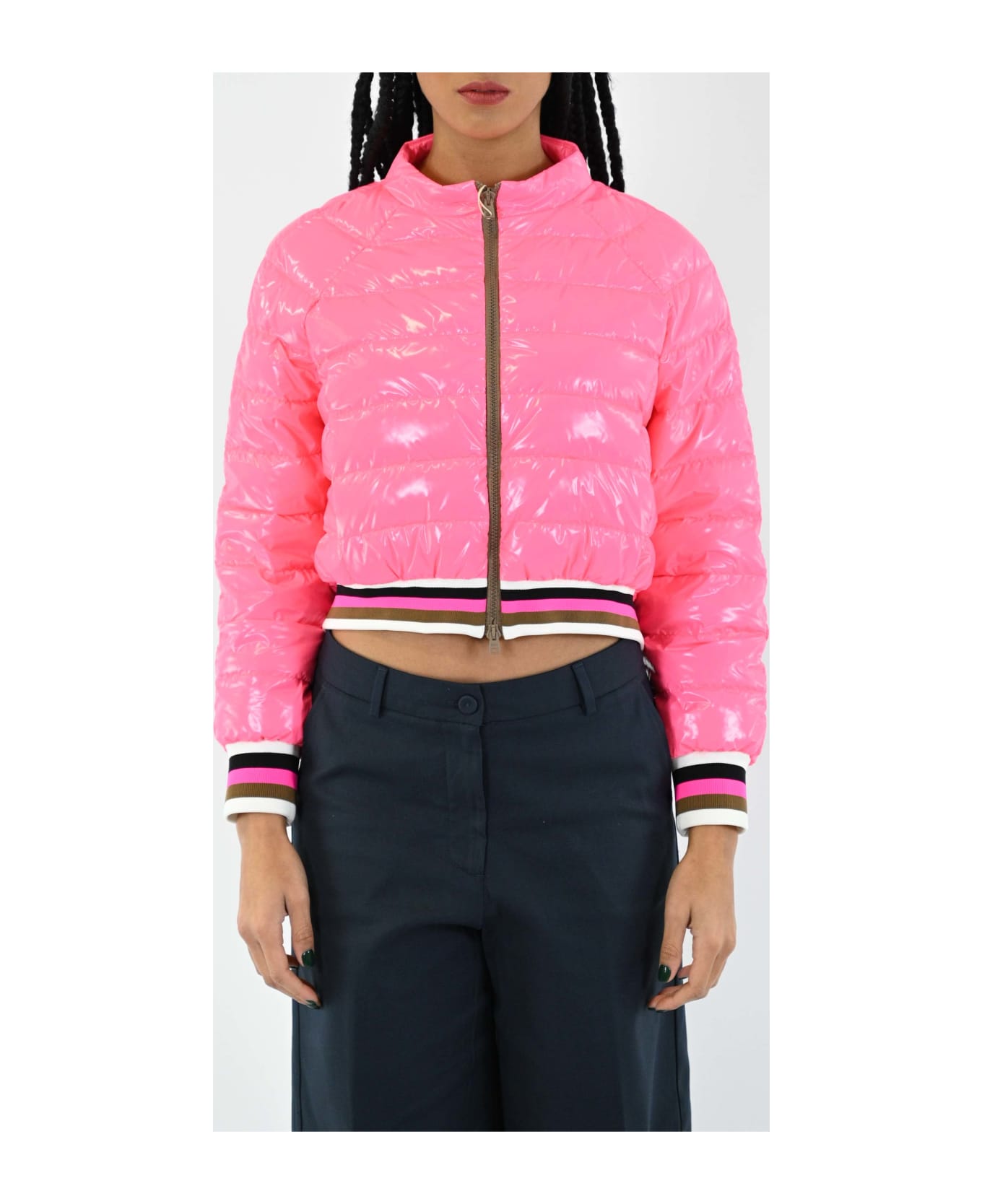 bomber jacket made in the iconic gloss, an extremely shiny lacquer-effect fabric that enhances the brilliance of the colors and the contemporary look. the model combines functional research and contemporary aesthetics because it is water resistant and finished with graphic details with an ironic and feminine allure. boxy fit