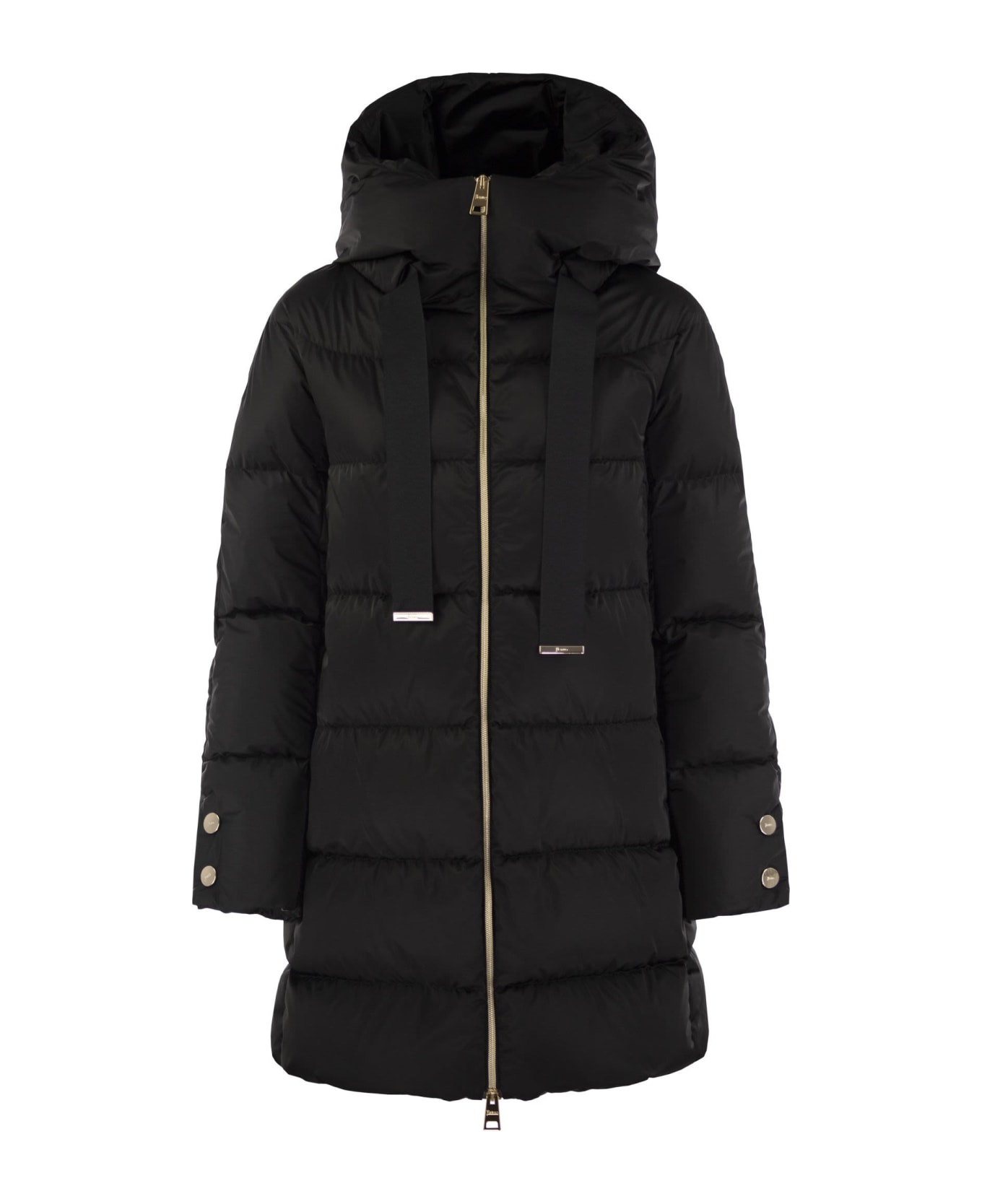 A-shape made from Herno Nylon: a durable fabric that combines good water resistance with a particularly smooth feel. With its soft padding and coarse-grain drawstring that decorates the hood, the model combines functional content with a refined, feminine aesthetic. - A-line fit - Down filling - Hood with grosgrain drawstring - Long sleeves - Zip closure - Welt pockets DESIGNER ID: PI1304D12170Z 9300