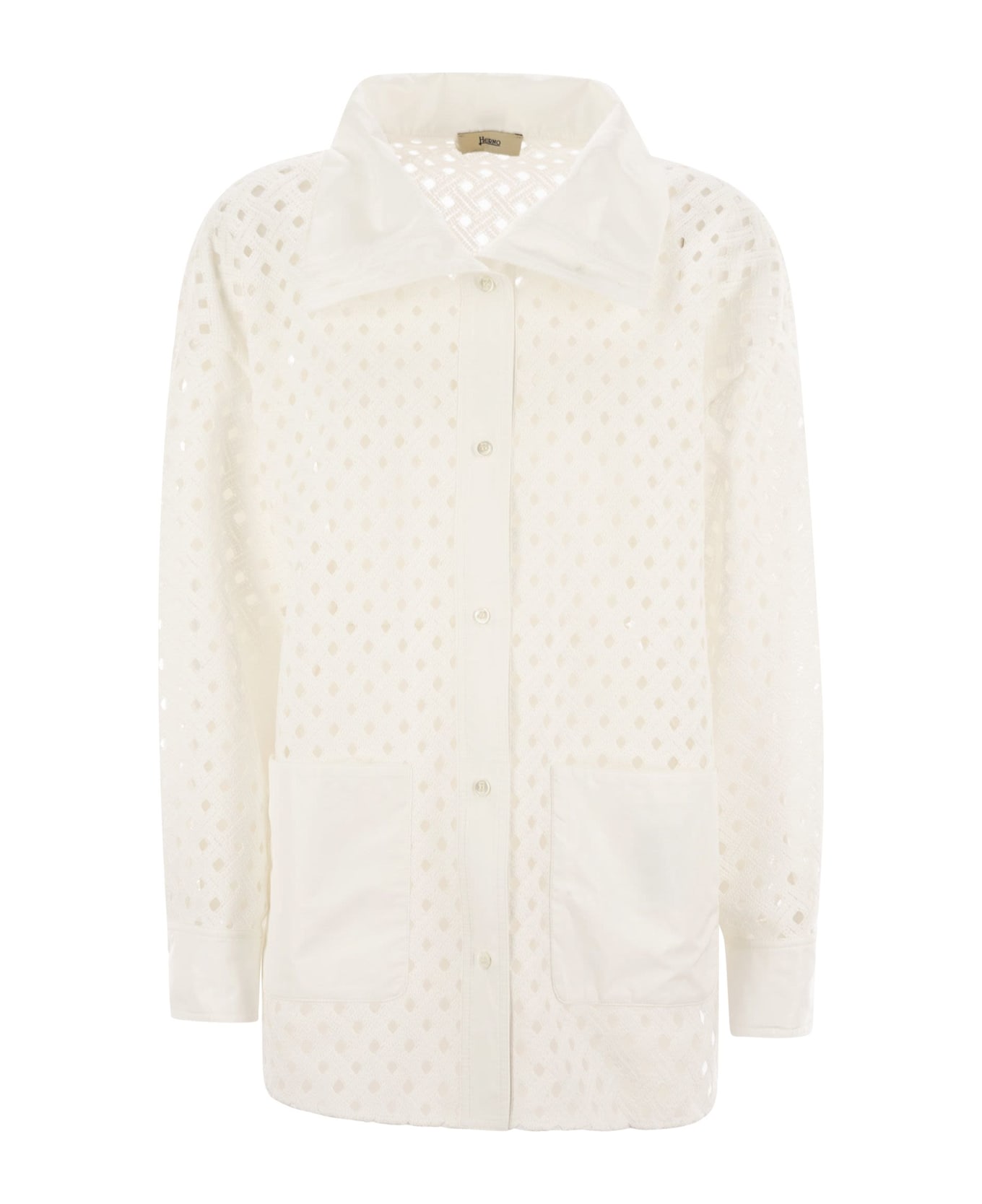 Shirt-cut jacket in perforated crochet-effect lace with a feminine flair. Light and sophisticated, the garment adds a fresh note to the leisure wardrobe and is enriched with a collar and pockets in taffeta with water-repellent yarn treatment. The fabric has a slightly iridescent finish with a sporty yet elegant appeal. - Relaxed fit - Maxi shirt collar - Long sleeves - Button cuffs - Pockets on the sides - Button closure - Made in Italy - Performance: Water-repellent treatment DESIGNER ID: GC000481D12702 1000 Composition: 100% Polyester