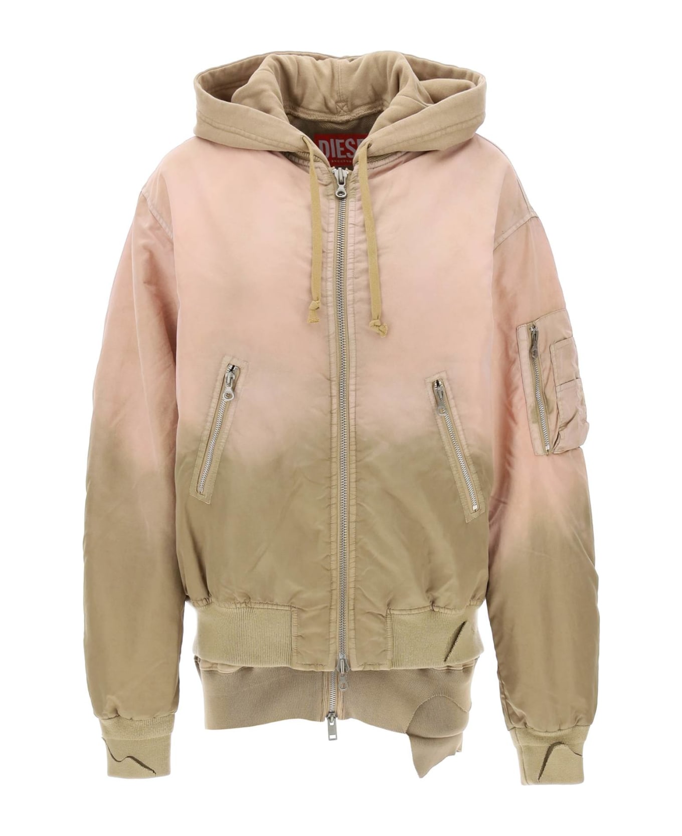 Made from dégradé nylon satin, this Diesel oversized bomber jacket boasts an integrated cotton French terry hooded underlayer reproducing the effect of a sweatshirt worn underneath the jacket. It features double zip fastening, side zip pockets, sleeve pocket, and destroyed rib knit trims. Lightweight polyester padding. The model is 177 cm tall and wears a size IT 38.