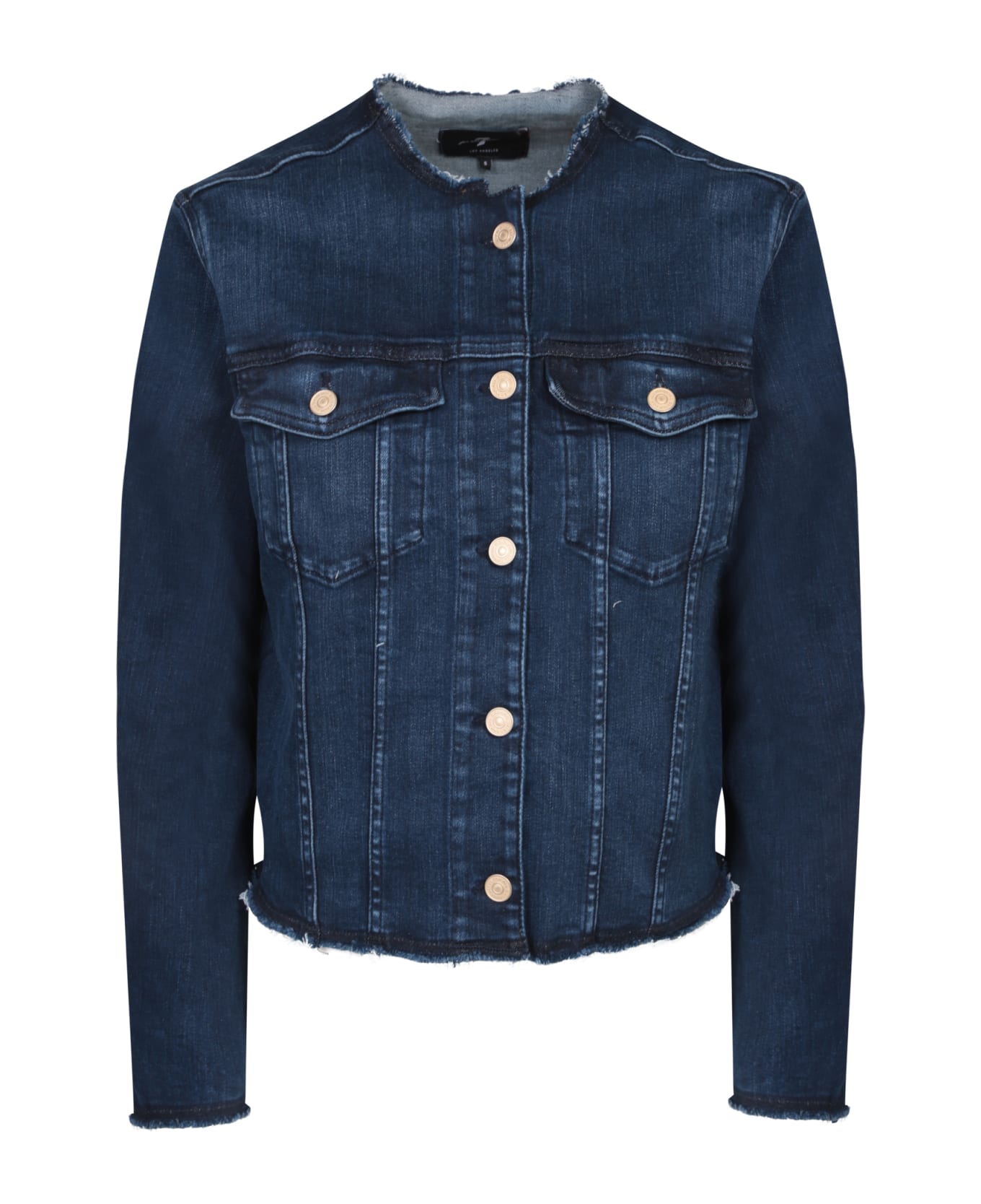 This Koko jacket by 7 For All Mankind features a sophisticated blue denim hue, blending traditional design with modern details such as a raw hem and classic collar.