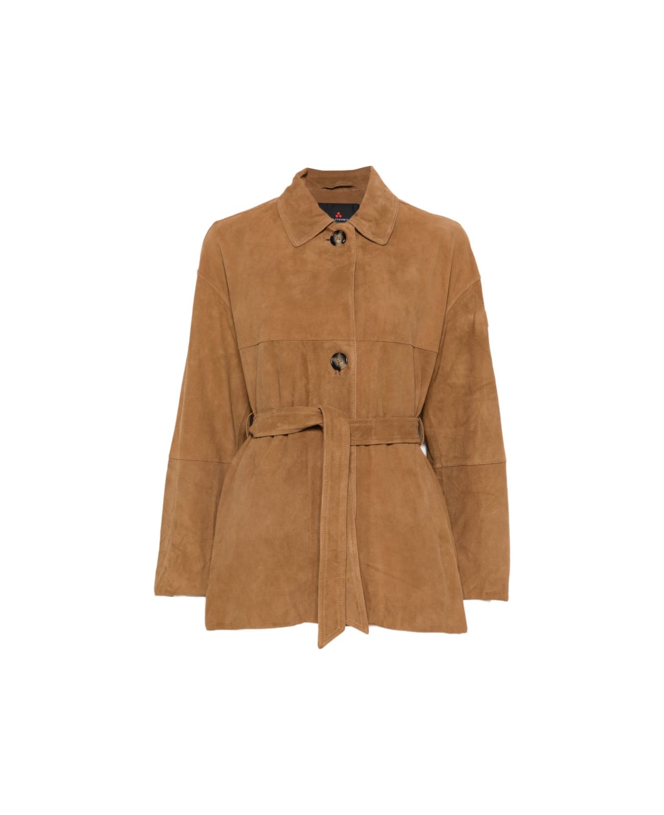 brown suede belt button fastening point collar panelled design long sleeves