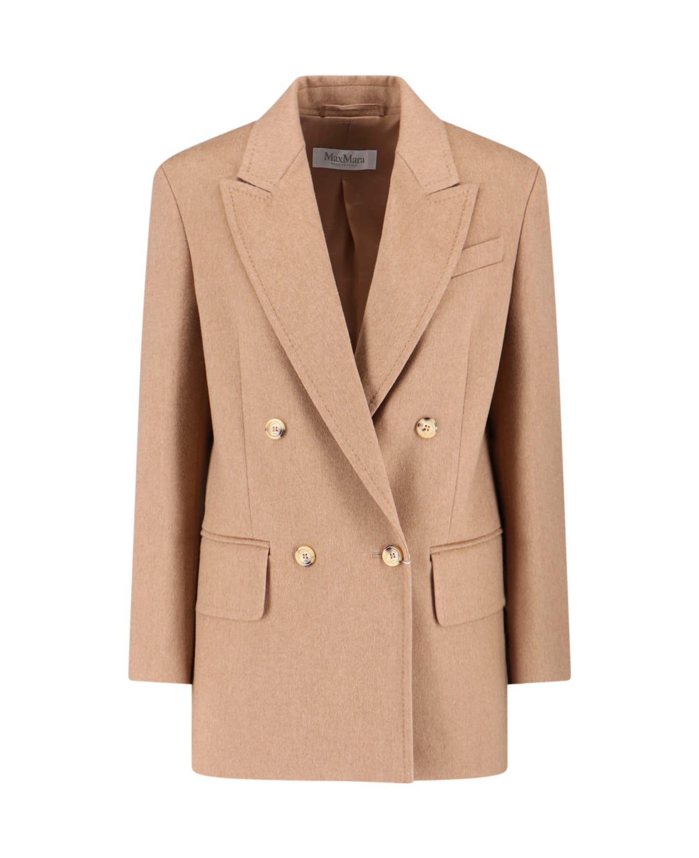 Max Mara 'Olimpia' double-breasted blazer in light brown camel wool with peak lapels, button closure, chest pocket, two side pockets, button cuffs, straight hem. Composition: 100% Camel Wool