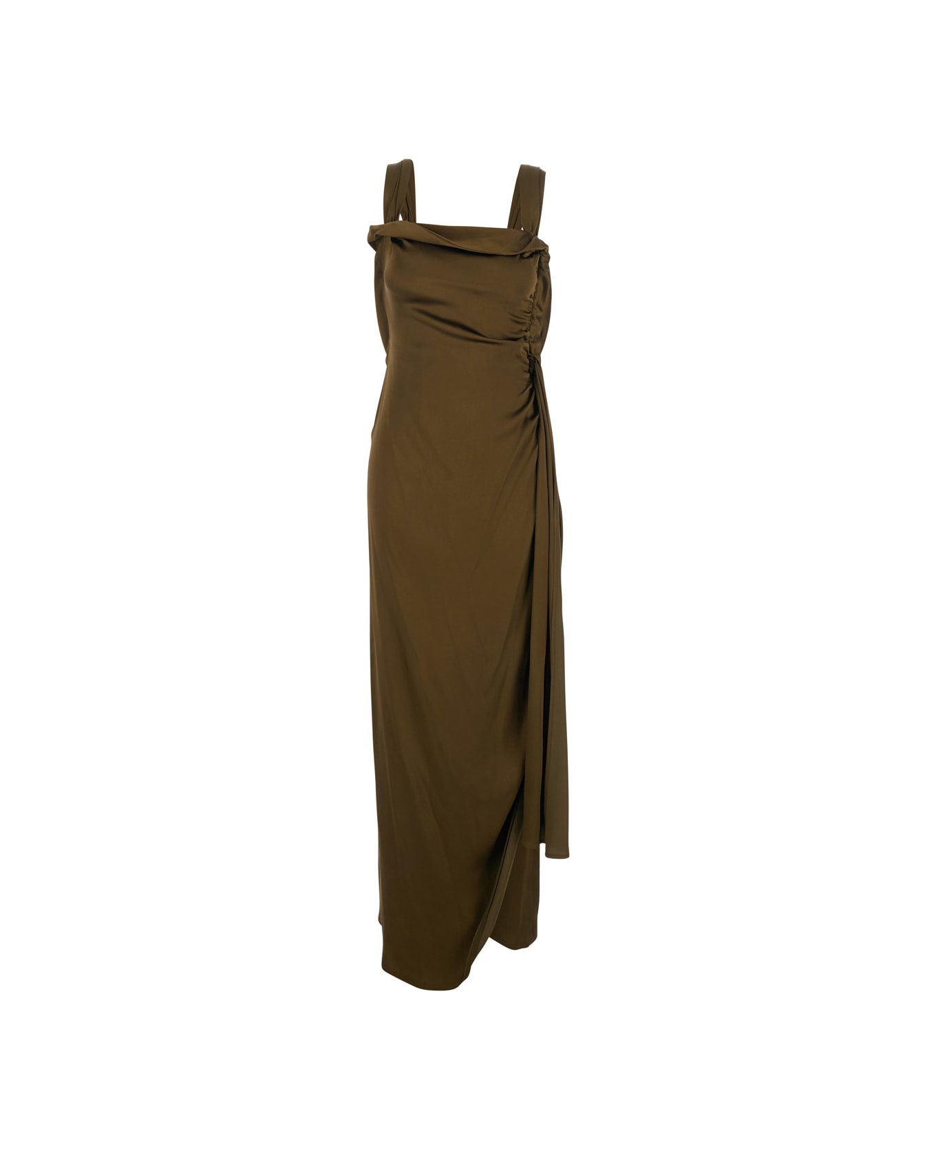 Brown Silk Blend Asymmetric Long Dress With Draping And Side Tie Closure Woman