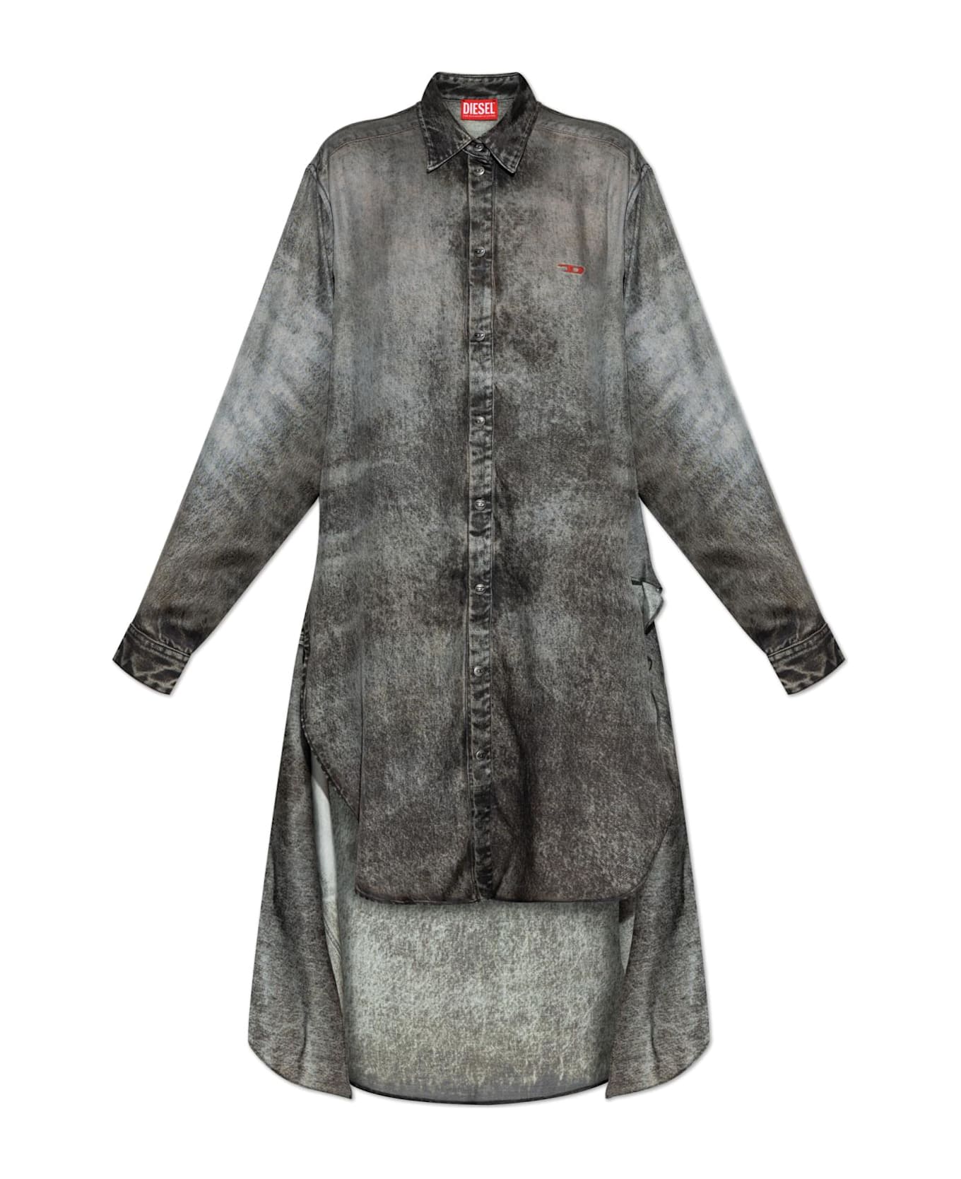 Embrace a refined sense of modernity with the D-ILETTA dress by Diesel. This effortlessly oversized shirt dress features an elongated, asymmetrical hem distinctly longer in the back adding a contemporary twist to classic sophistication. Crafted from flowing, viscose fabric with a wash reminiscent of aged denim, it offers an exceptionally soft touch and mesmerizing shades of gray, enhanced by a unique, marbled finish. Long sleeves with tailored cuffs lend an elevated silhouette, while a subtle, red embroidered logo provides the perfect note of distinction. Blending relaxed elegance and unmistakable Diesel craftsmanship, this dress epitomizes easy luxury for the discerning wardrobe. Why choose this product? Exquisite drape and comfort from premium viscose Contemporary, oversized silhouette with an elongated back hem Transitional gray hues and marbled effect for unique character Embroidered Diesel logo as a discreet luxury signature Versatile style sophisticated for day, elevated for evening