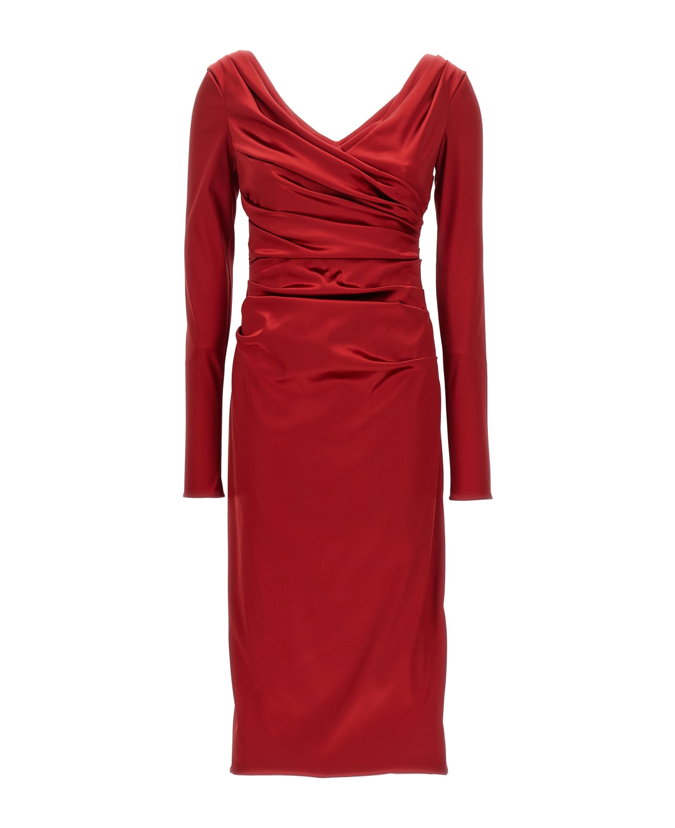 Draped midi stretch satin fabric dress with long sleeves and plunging neckline.