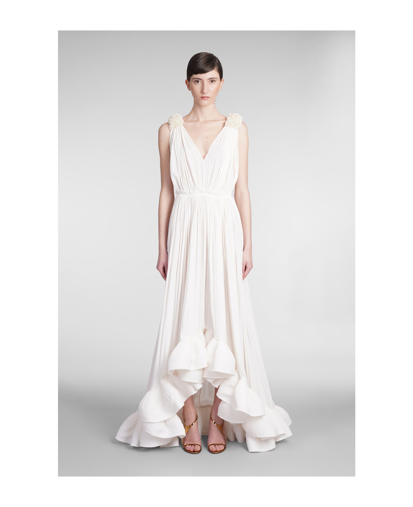 Dress in white polyester, V neck, asymmetrical hem, sleeveless, pleated design, zip clousure, bead embellished, 100% polyester, 100% glass, Model is 180 cm and wears 38, Made in Spain