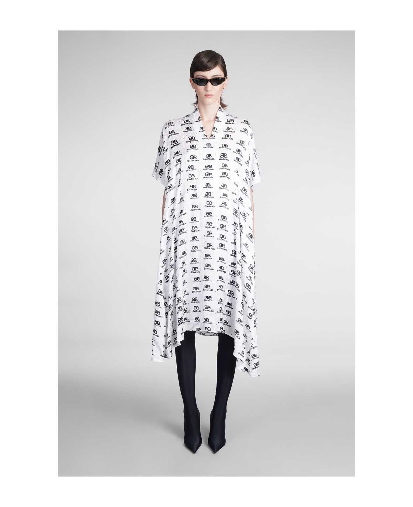 Dress in white silk, asymmetrical cut, short sleeves, collar, all over iconic print, Made in Italy, 100% silk, Model is 180 cm and wears 38