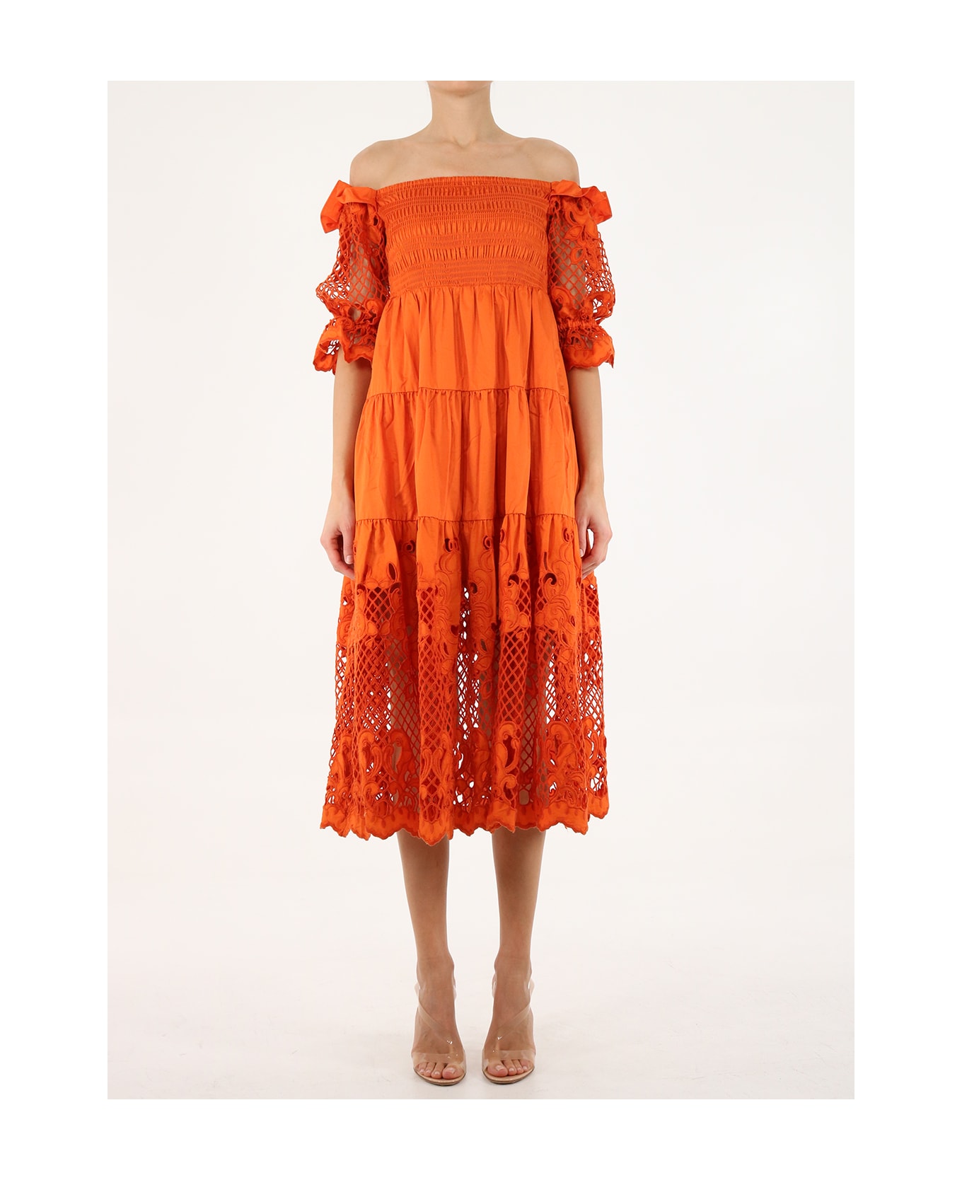 Orange midi dress with embroidered details on front, back and hem. It features puff sleeves, off the shoulders neckline, bodice and shirring at the waist.