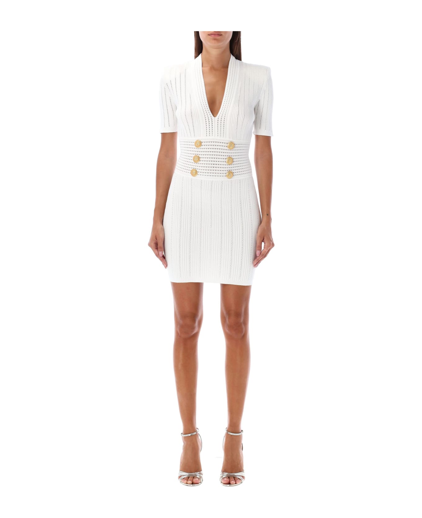 Knit Mini Dress By Balmain. Featuring: Short Sleeves V-neck Decorative Buttons At Front Padded Shoulders Cable Knit Trim Stretch Slim Fit Rear Zipped Closure Model Is 1,72 M Tall And She Is Wearing Size 36