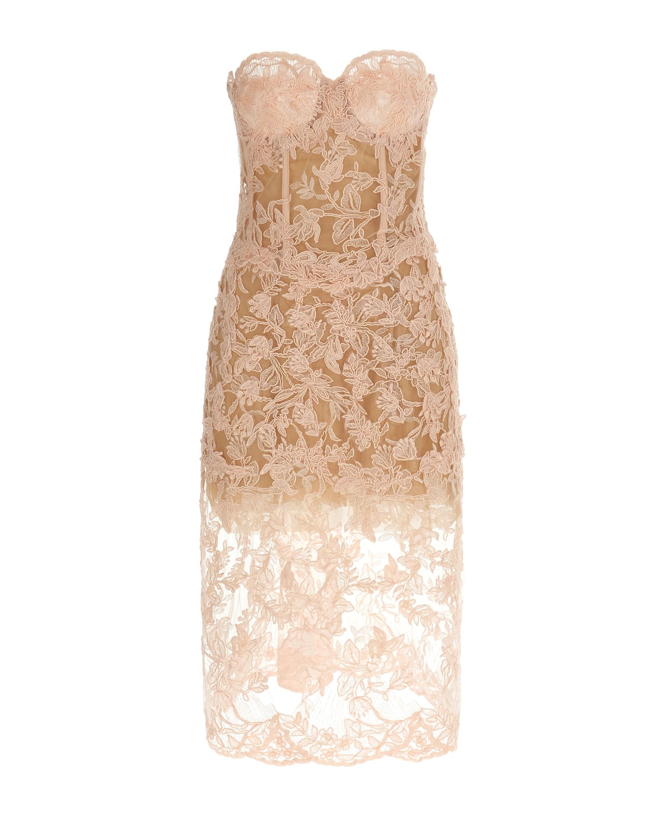 Off-the-shoulder tulle and lace midi dress with corset top, inner cues, front heart-shaped neckline, lining, wide V-neck, zip closure and back split.