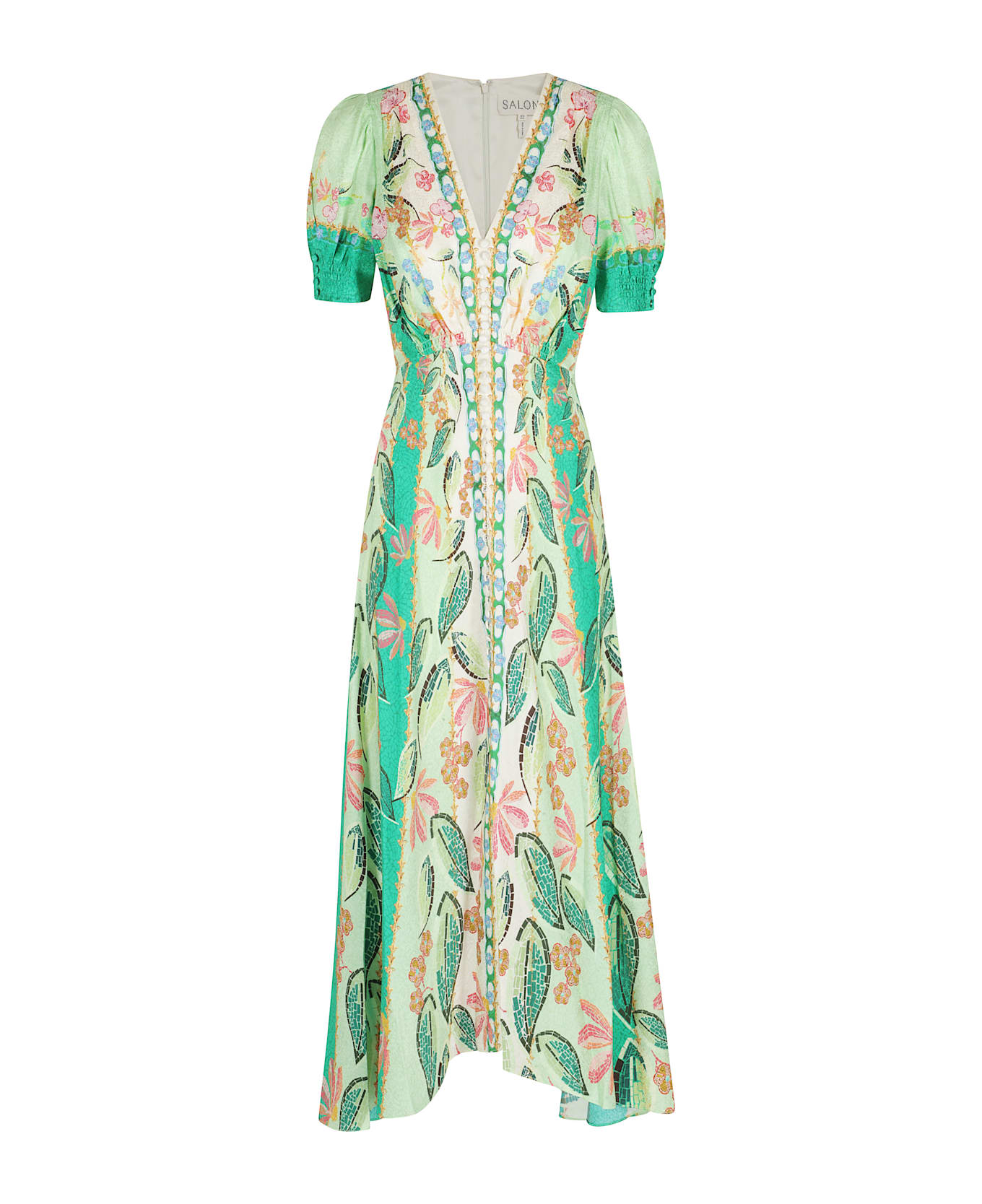 Category: Dress Item: Lea Brand: Saloni Color: Green Neckline: V-neck Closure: Back zipper Details: Silk fabric with floral print SIZE AND FIT Fit: Regular Fit: Flared Length: Long with asymmetrical hem Sleeve Length: Short balloon