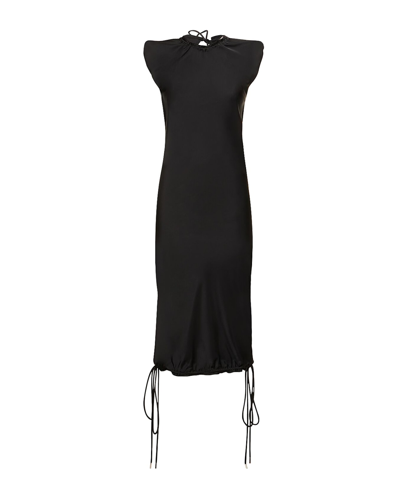 Long dress with a fitted silhouette, made from black fabric. the design features pronounced straps and a minimalist neckline. the length of the dress reaches the knee, with a draping detail that adds a touch of style. the sides are embellished with adjustable cords, allowing for customization of the fit. perfect for elegant occasions or special evenings.