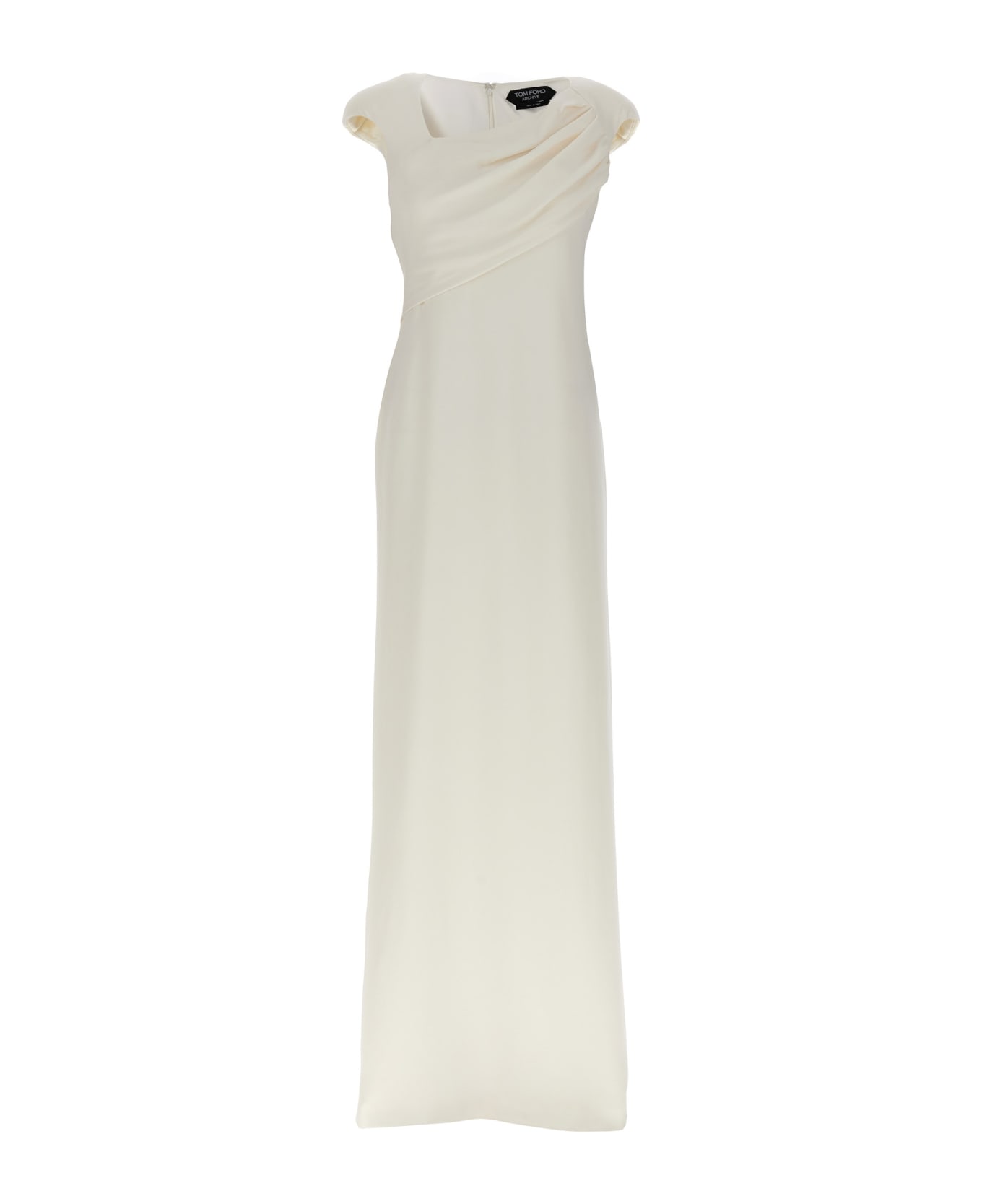 Long silk dress with soft neckline, padded shoulder straps, short sleeves, and back zip closure. Composition: 100% silk