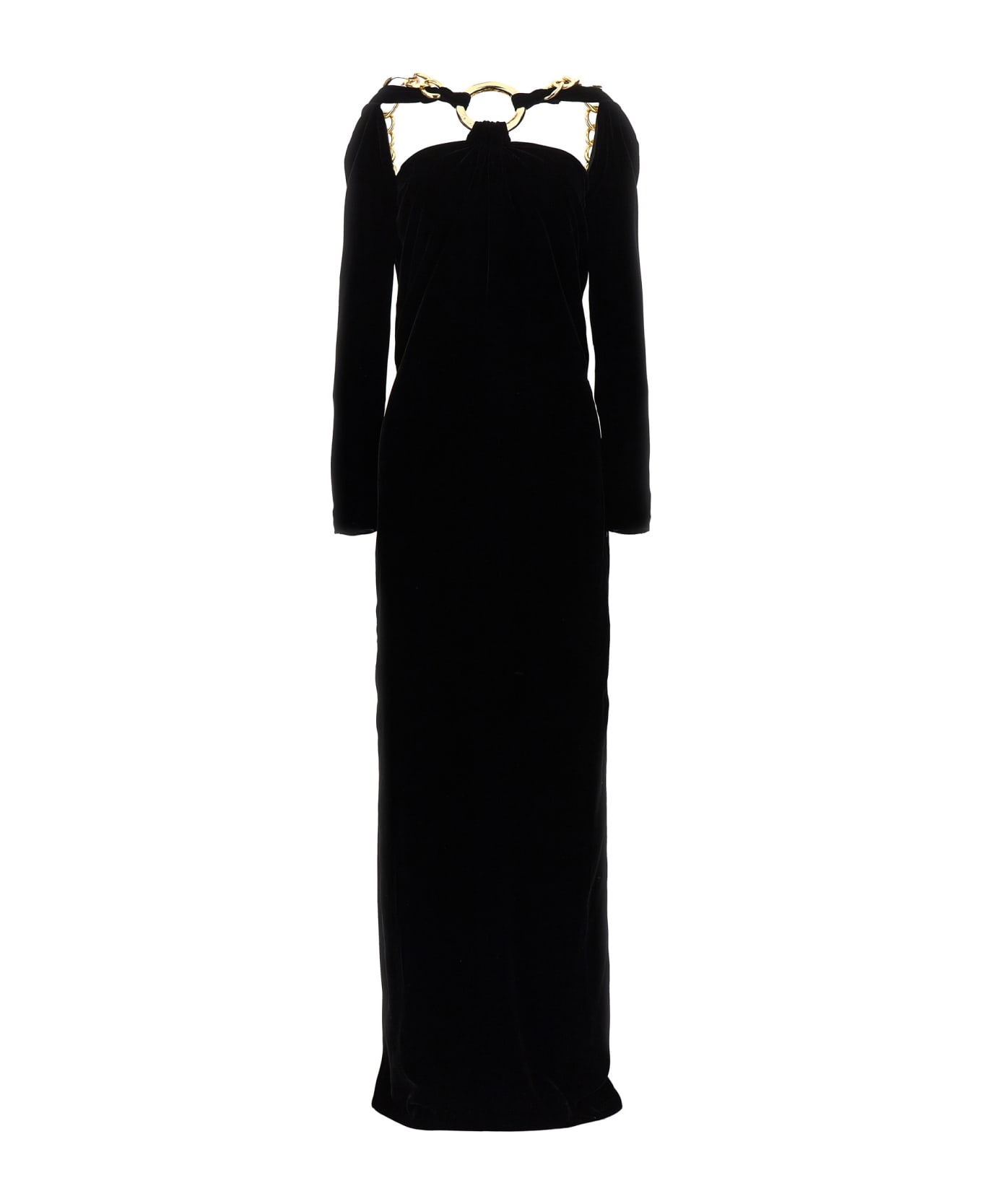 Long velvet dress with chain detail on the neckline, front cut-outs, long sleeves, back zip closure. Composition: