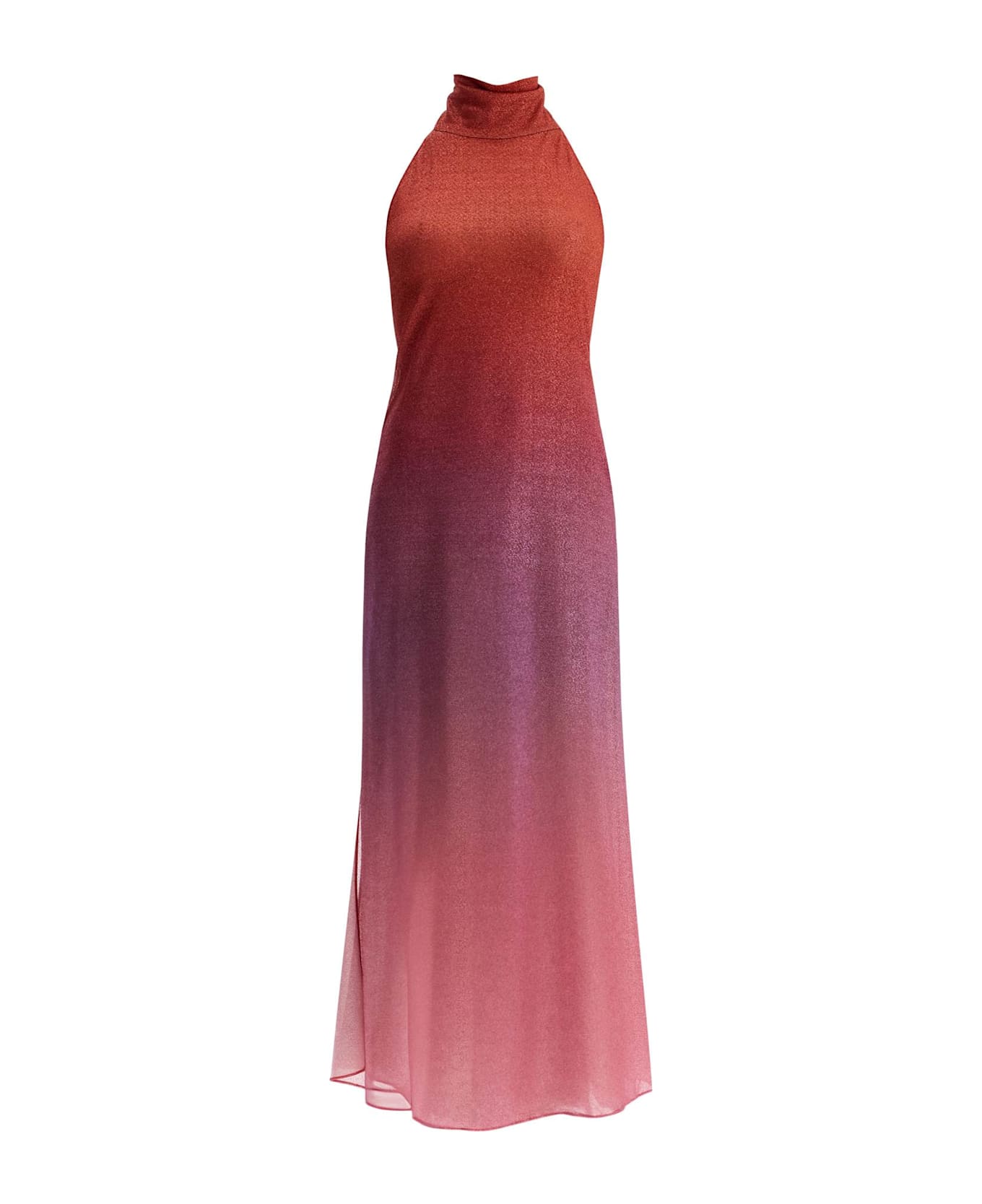 Crafted from lightweight gradient lurex jersey, this Oséree maxi dress features an open-back design with a high neck and a slightly flared silhouette with a deep side slit. It fastens with buttons at the back of the neck. The model is 177 cm tall and wears size S.